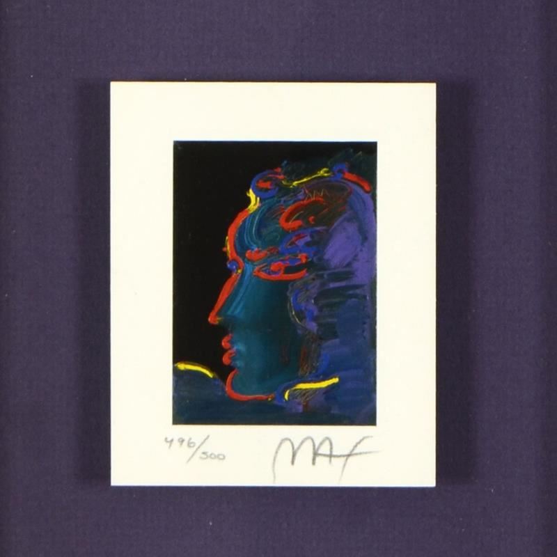 "Abstract Profile I" is a limited edition lithograph on paper by Peter Max, numbered 496/500 and hand signed by the artist. This piece comes framed and includes Certificate of Authenticity. Measures approximately 15.5" x 15" (frame), 3" x 3.5" (image).
