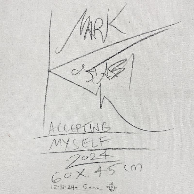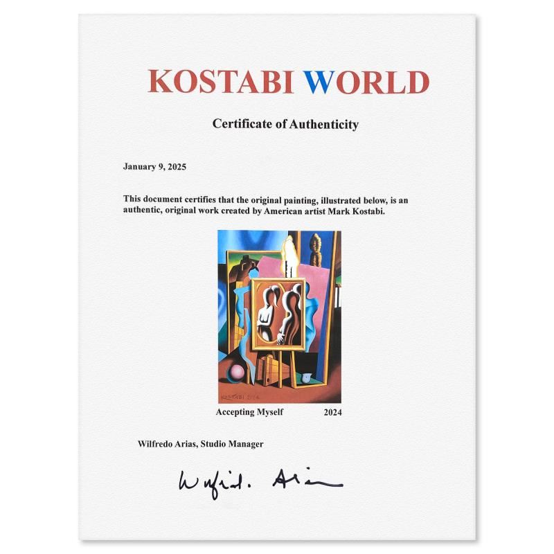 "Accepting Myself"is an original oil painting on canvas by Mark Kostabi, hand signed by the artist. This piece comes custom framed. Includes Certificate of Authenticity. Measures approx. 27" x 21" (frame), 24" x 18" (image). This item requires special handling and may have a longer than usual turnaround.