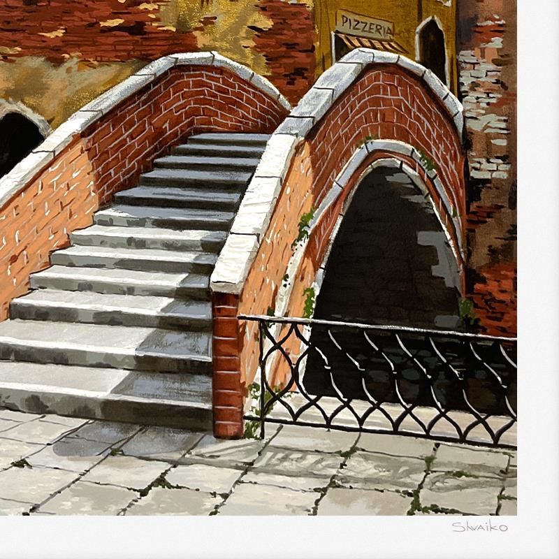 "Across the Bridge (White)" is a limited edition printer's proof serigraph on paper by Viktor Shvaiko, numbered 2/3 and hand signed by the artist. Includes Letter of Authenticity. Measures approx. 35.5" x 45" (border), 30" x 40" (image).