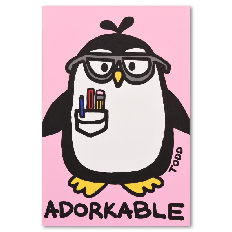 "Adorkable" is an original acrylic painting on gallery wrapped canvas by Todd Goldman, hand signed by the artist. Includes Letter of Authenticity. Measures approx. 24" x 36" (image). Due to the way this piece was stored there may be minor wear or signs of age (such as wear on the corners) but the piece is in overall good condition.