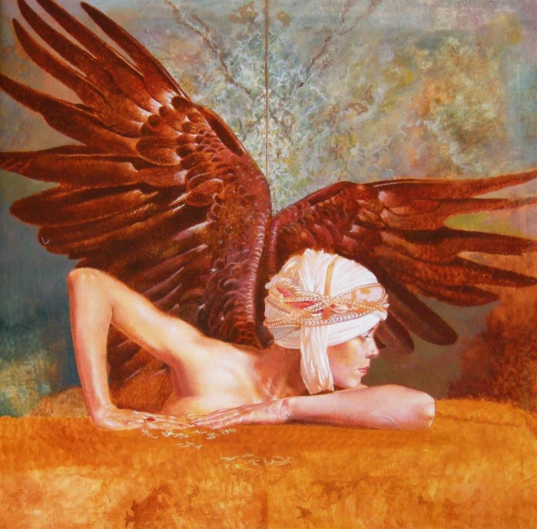 World-renowned Italian artist, Angelo Vadala, demonstrates his unique symbolic style of a girl with wings in this oil on canvas. The painting measures 31 x 31; framed image measures approx. 43 x 43.