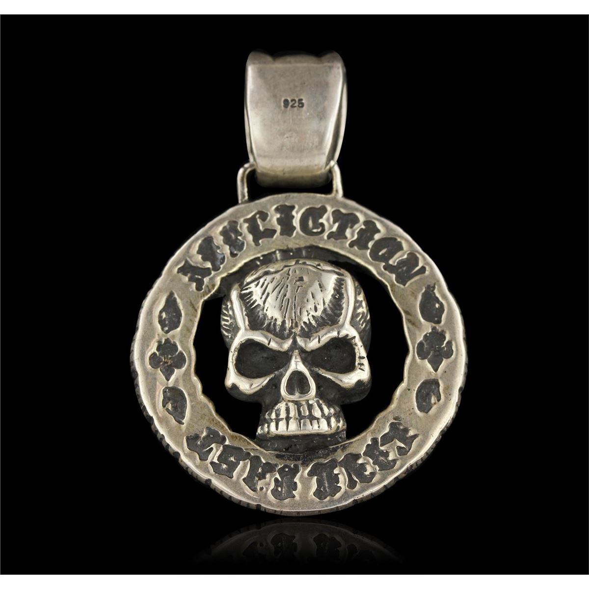 One Sterling Silver Affliction Live Fast skull pendant without chain weighing 43.5 grams.