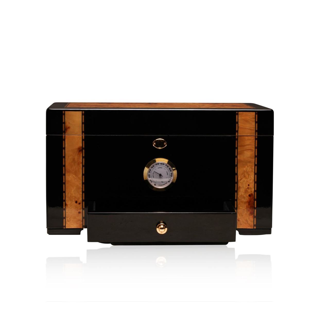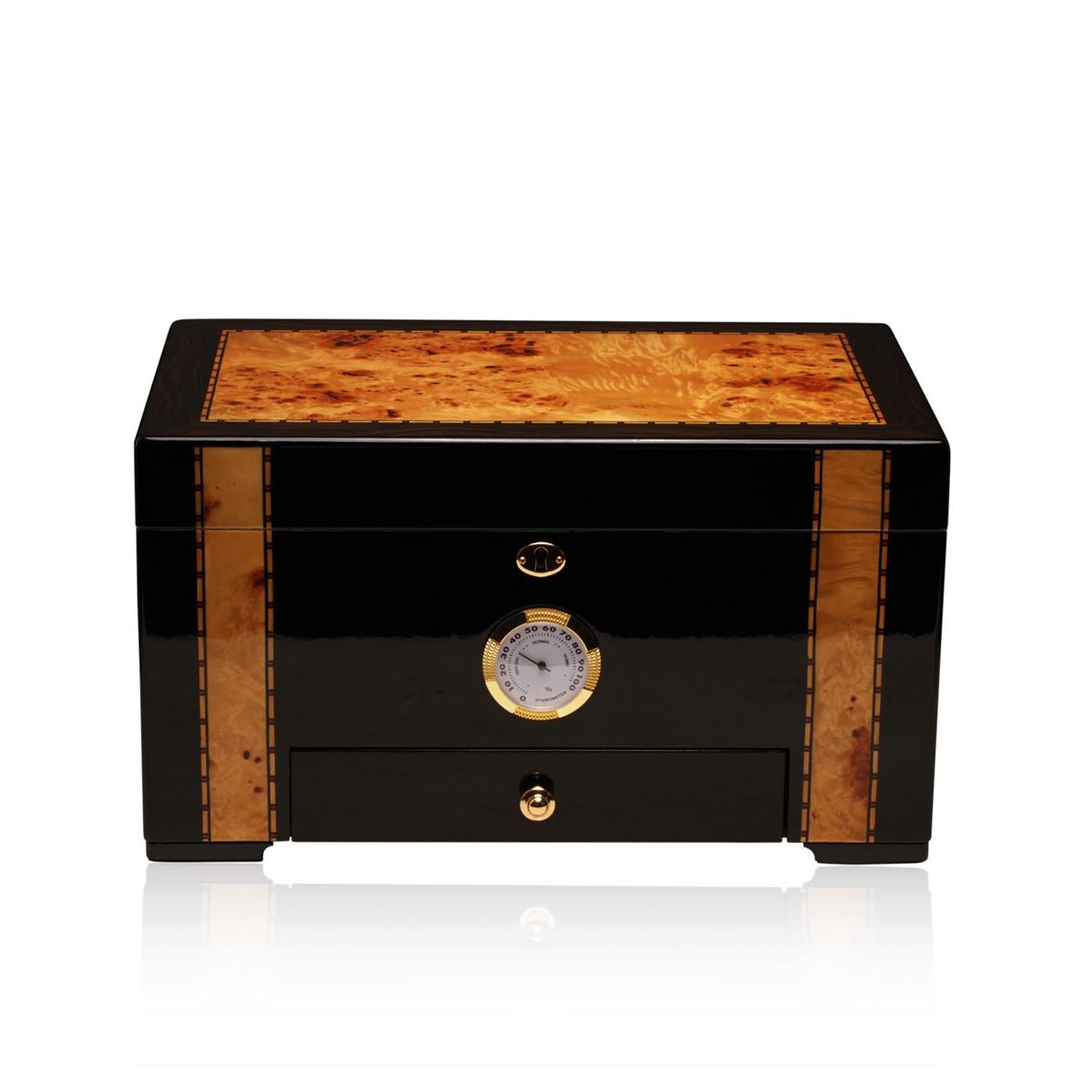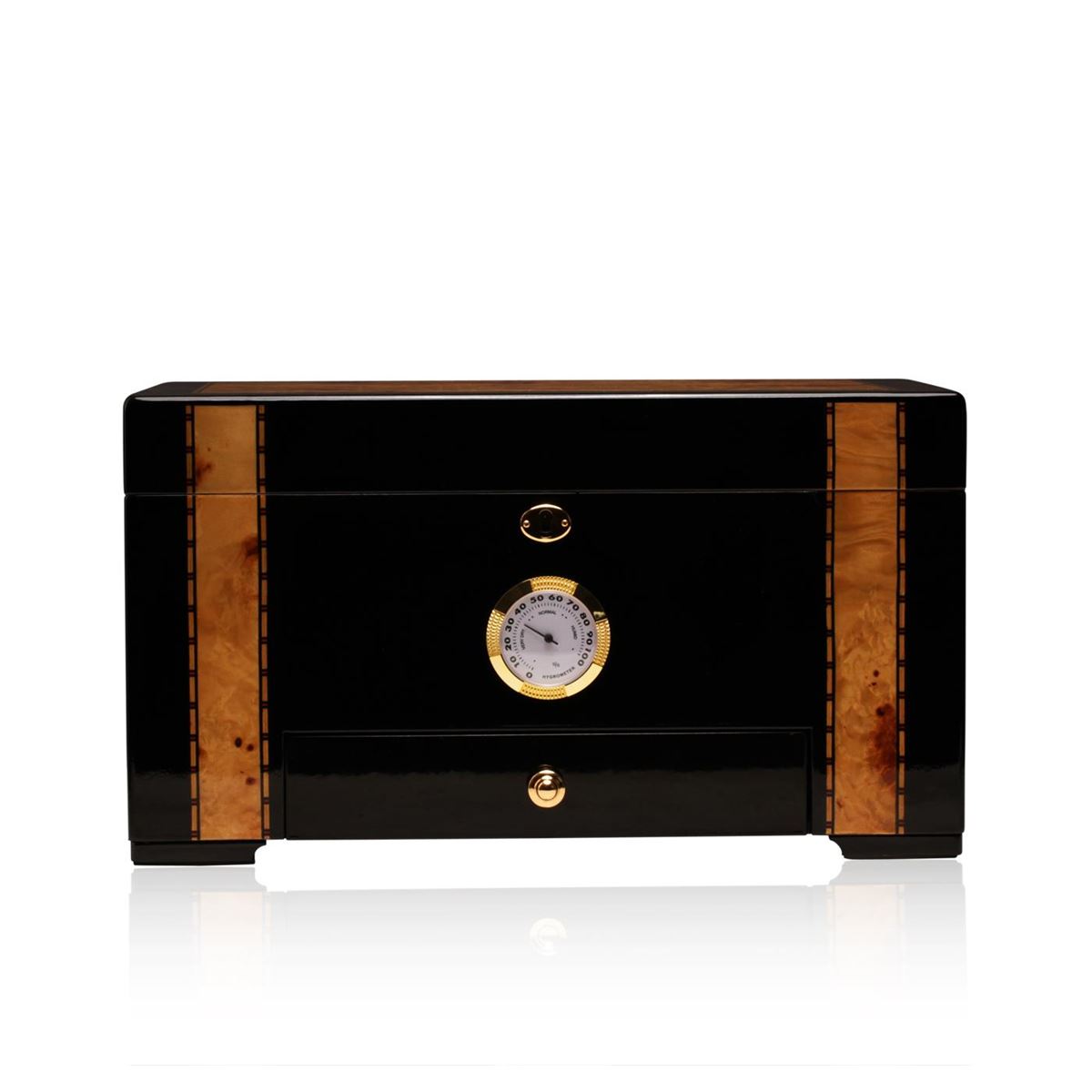 One deluxe cigar humidor featuring a glossy African blackwood with genuine birdseye maple inlay exterior lined with premium Spanish cedar and solid brass hardware including hidden quadrant piano hinges, inset handles, and lock and key. This quality work also features a felt lined accessory drawer and large external brass hygrometer. Beautifully handcrafted to provide your cigars with the perfect environment for storage. This deluxe humidor will surely enhance your cigars smell and taste. Includes: Humidor, Hygrometer, Humidification System, Accessories, Instructions Manual. Measures 14.5x8.5x9 inches.