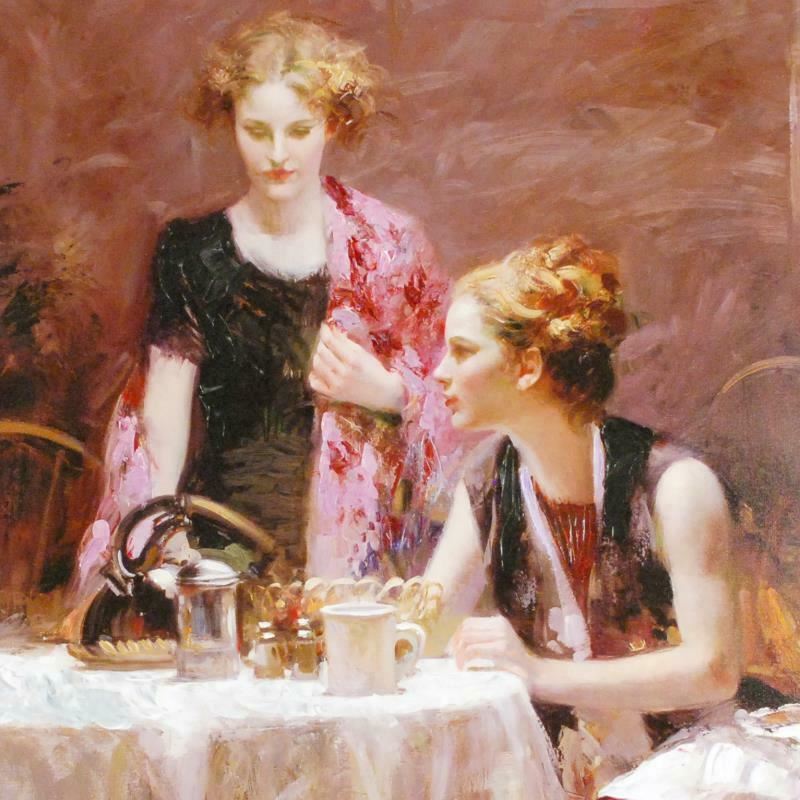 "After Dinner" is a hand embellished limited edition giclee on canvas by Pino (1939-2010), numbered and hand signed. Includes Certificate of Authenticity. Measures approx. 32" x 38" (image). This piece is not stretched.