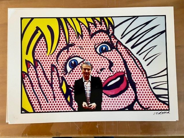 Posing with his subject, a giant Lichtenstein image, filmmaker, Director & artist Verona. Signed color photo. 12x17.5"