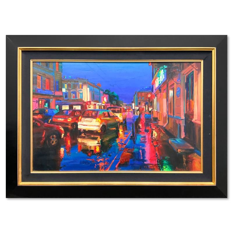 "After the Rain" is an original oil painting on canvas by by Evgeny Lushpin, hand signed by the artist. This piece comes framed. Includes Letter of Authenticity. Measures approx. 33.5" x 45.5" (frame), 22.5" x 34.5" (image). There is some wear on the frame.