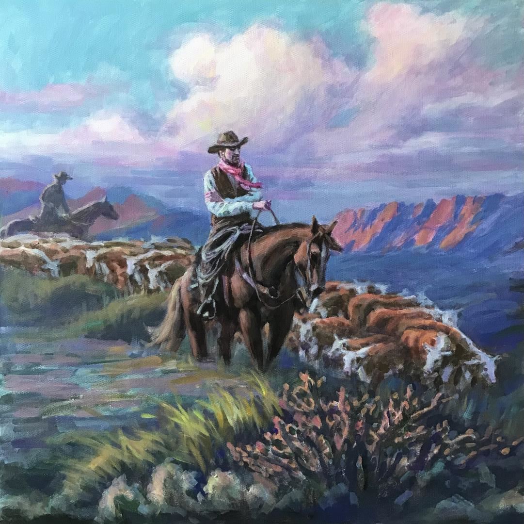 Cowboys move their herd along. An original 24x24" acrylic on stretched canvas by Richard Ho. w/COA.