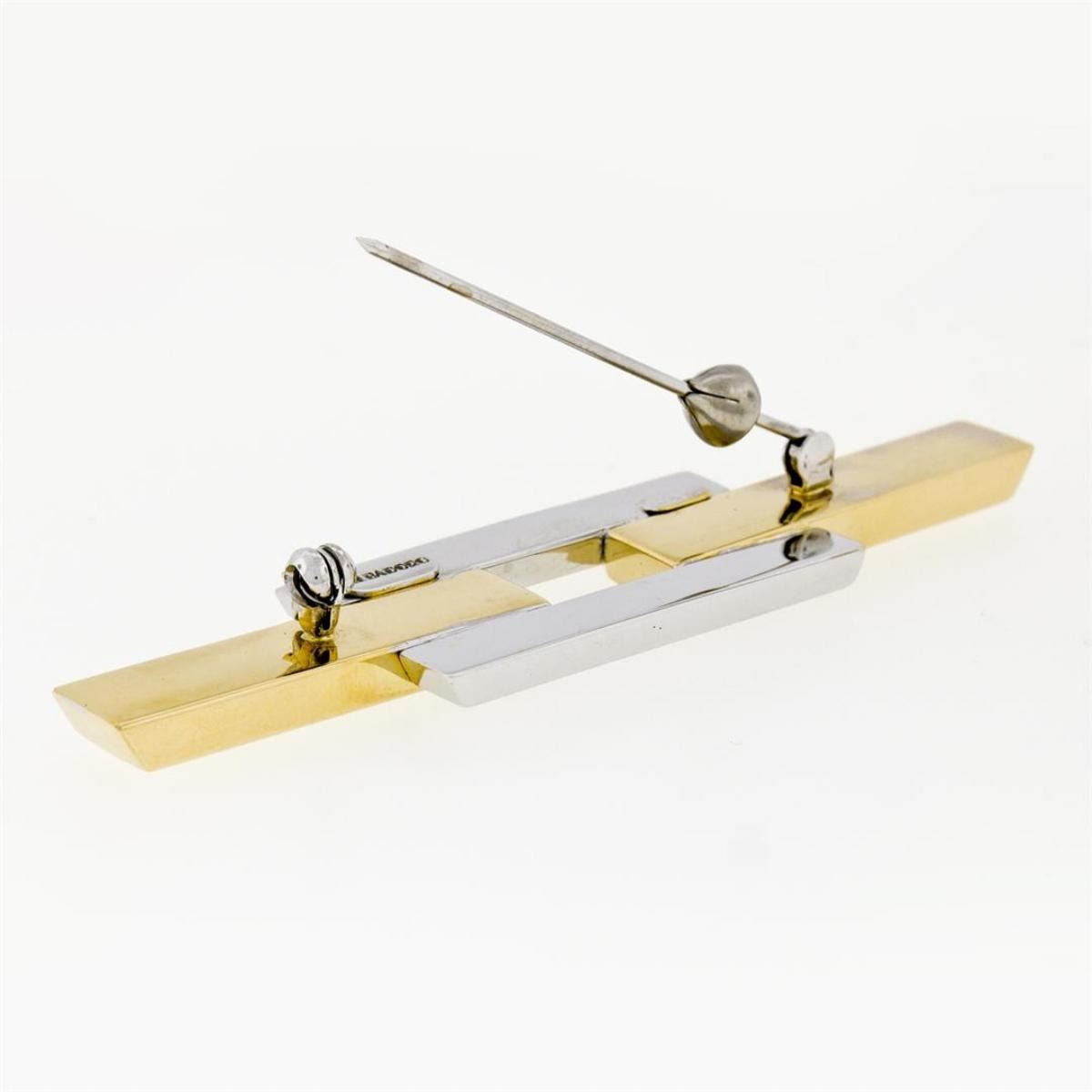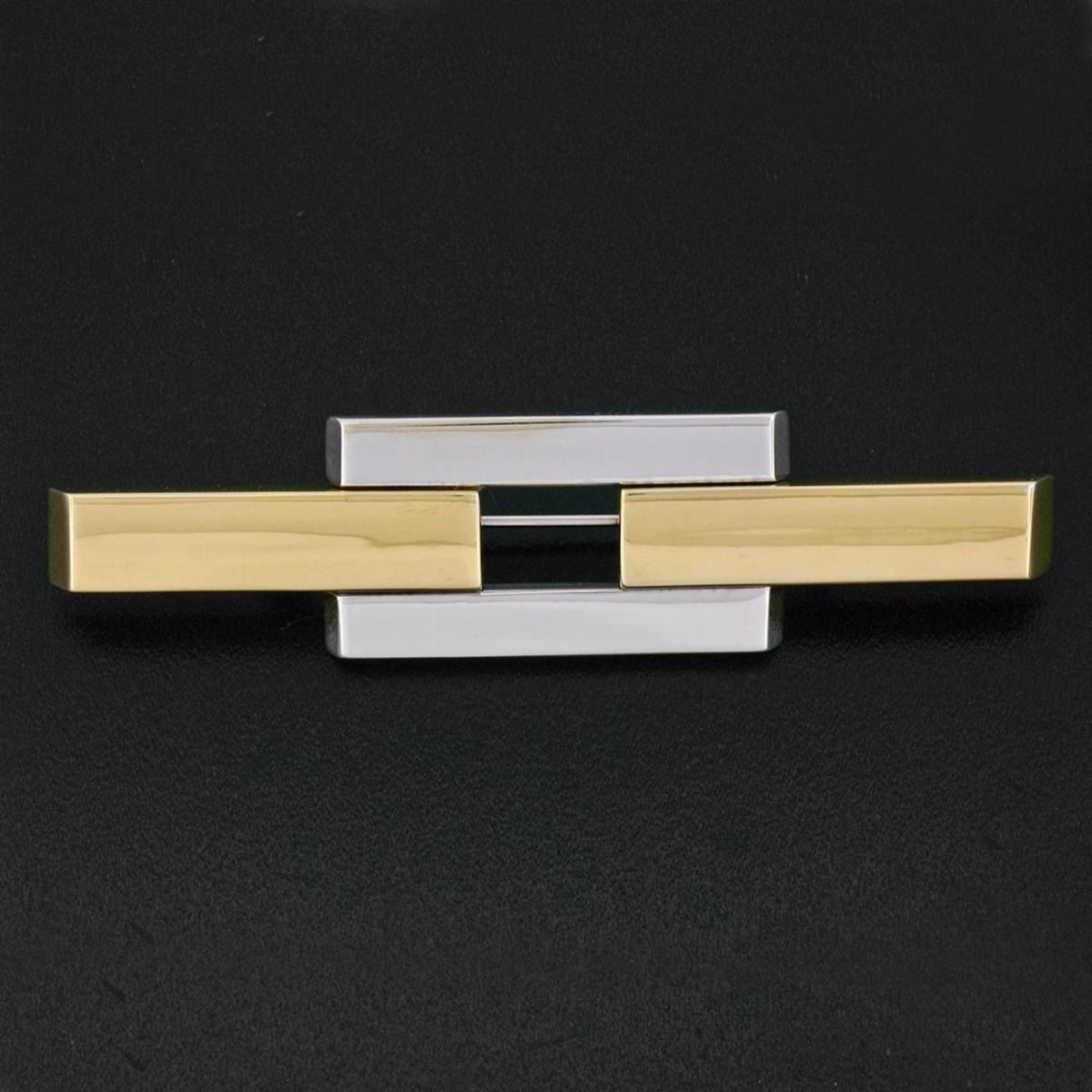 Albadoro Italian 18K Yellow White Gold Unique Geometric Polished Bar Brooch Pin. A solid 18k yellow and white gold geometric bar pin made in Italy by Albadoro. Measures 16.6x68.0mm and weighs a total of 9.01 grams.