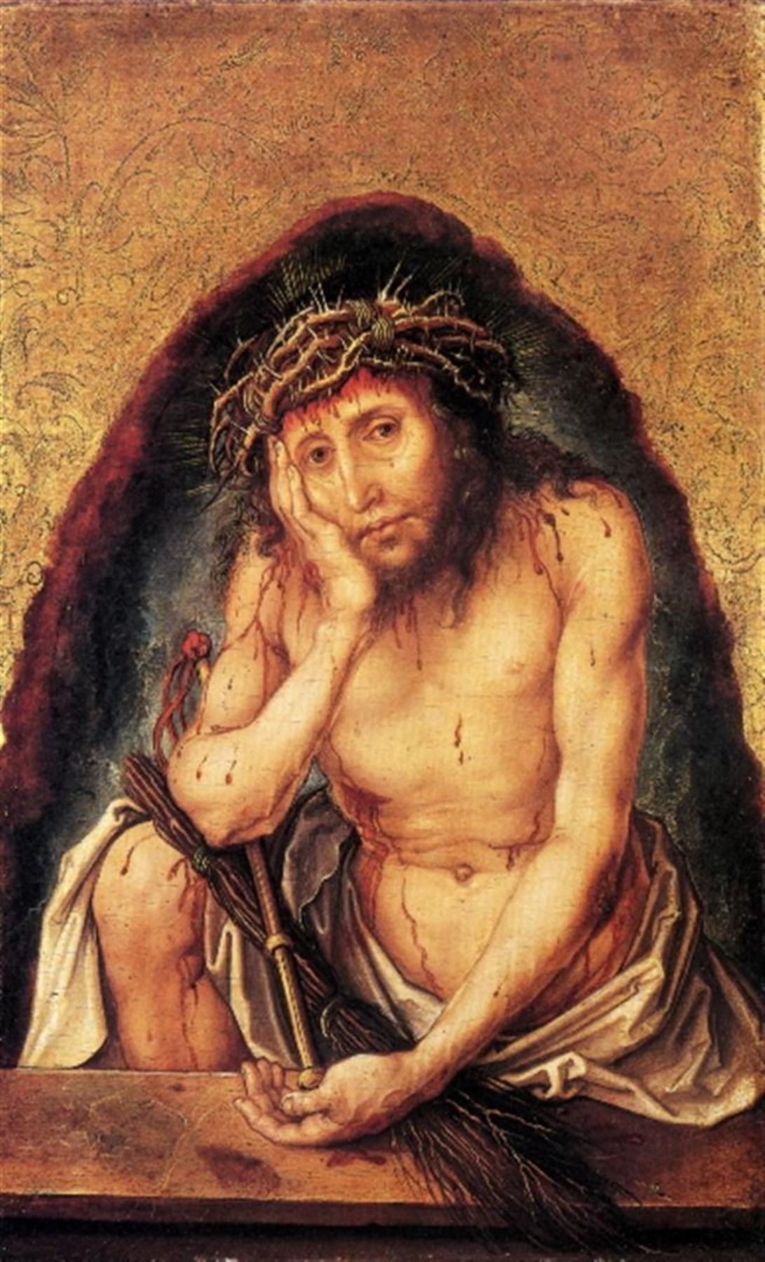 Artist: Albrecht Dürer - Title: Christ in Pain - Medium: Fine Art Giclee on Canvas - Image Size: Approximately 32 inches x 19.5 inches - Unframed on Unstretched Canvas - Biography: Albrecht Dürer (c. May 1471 - April 1528), sometimes spelled in English as Durer or Duerer (without an umlaut), was a German painter, printmaker, and theorist of the German Renaissance. Born in Nuremberg, Dürer established his reputation and influence across Europe when he was in his twenties due to his high-quality woodcut prints. He was in communication with the major Italian artists of his time, including Raphael, Giovanni Bellini and Leonardo da Vinci, and from 1512 was patronized by Emperor Maximilian I. Dürer is commemorated by both the Lutheran and Episcopal Churches.His watercolours mark him as one of the first European landscape artists, while his woodcuts revolutionized the potential of that medium.