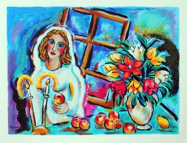 Artist: Alex Meilichson - Title: Glowing Candles - Medium: Serigraph on Fine Art Paper - Signature: Hand-signed by the Artist - Limited Edition: 450 - Image Size: 9 inches x 12 inches - Paper Size: Approximately 10.5 inches x 13.5 inches - Unframed - Details: This work comes with a Certificate of Authenticity - Alex Meilichson has developed a figurative style, using a palette of brilliant colors. His favorite media are ink, acrylic and oil on canvas. He paints Judaic themes, landscapes and still life in an expressionist 'Ecole de Paris' approach. -