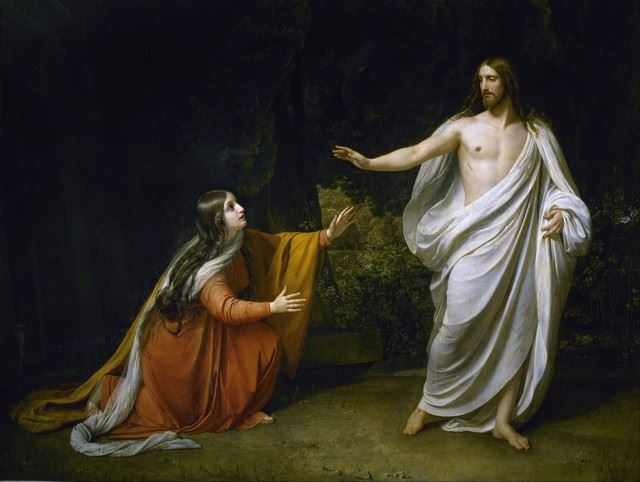 Artist: Alexander Ivanov - Title: Christ Appearing to Mary Magdalene after the Resurrection - Medium: Fine Art Reproduction Giclee on Canvas - Image Size: Approximately 24 inches x 32 inches - Unframed on Unstretched Canvas - Alexander Ivanov painted Christ's Appearance to Mary Magdalene after the Resurrection in Italy as a progress report to his sponsors -- the Society for the Encouragement of Artists in St Petersburg. The canvas was sent to the Russian capital in May 1836, and exhibited to great acclaim at the Imperial Academy of Arts. Ivanov was elected an academician and the Society for the Encouragement of Artists donated the painting to Tsar Nicholas I. Although Ivanov paints a canvas wholly in the traditions of academic art, the work is also enriched by the artist's direct contacts in Italy with High Renaissance paintings.