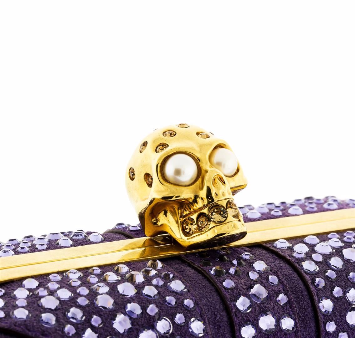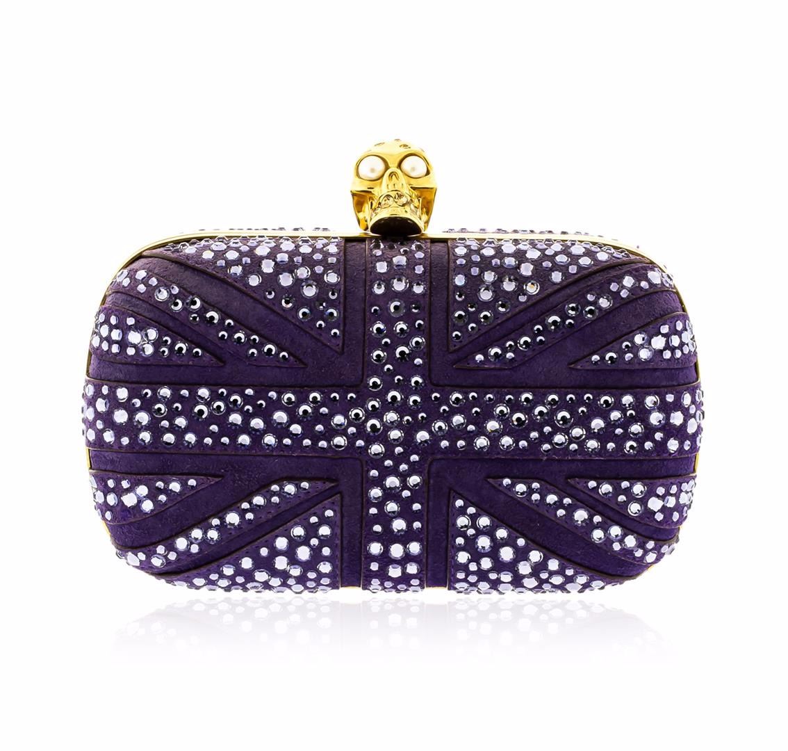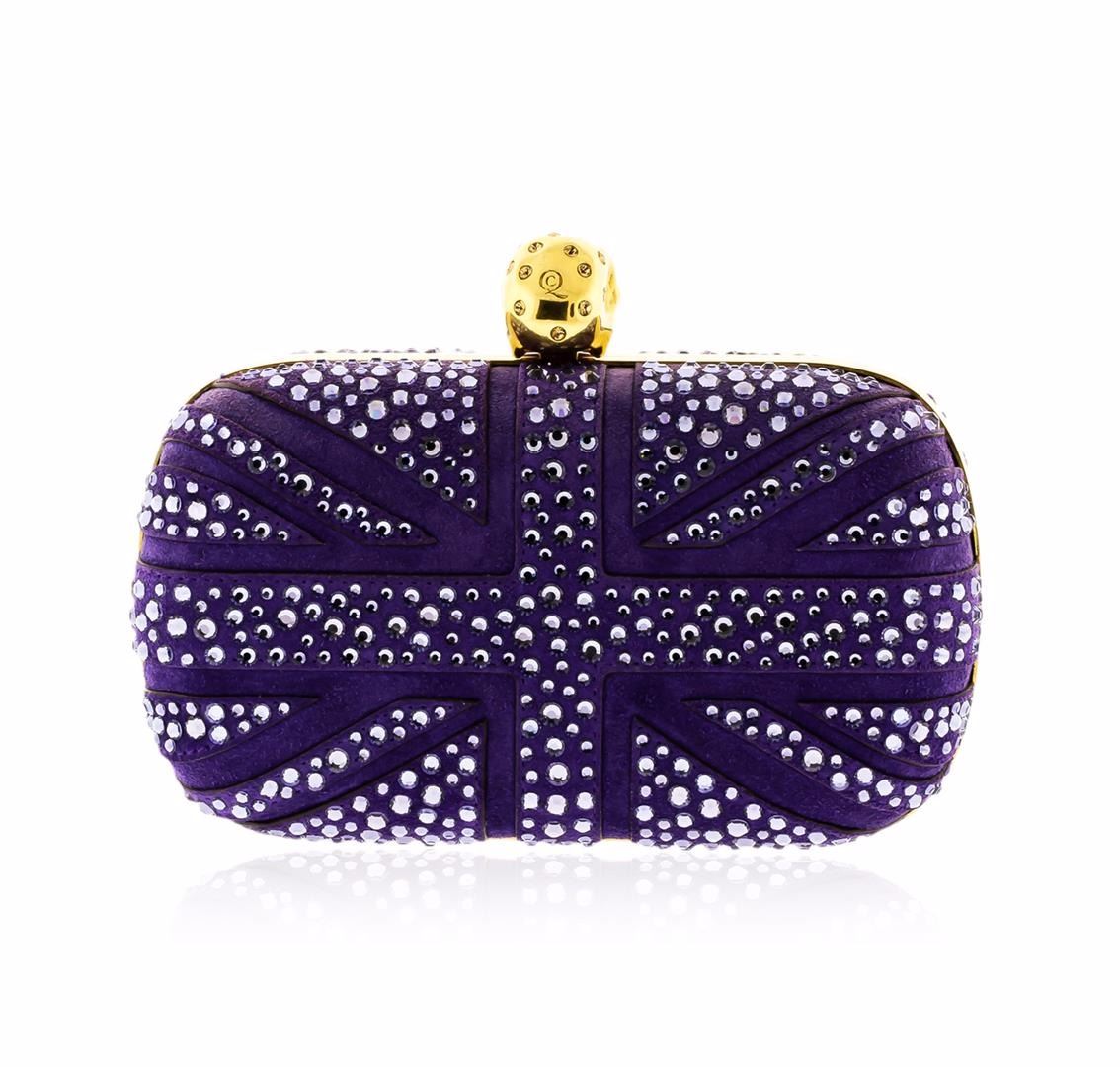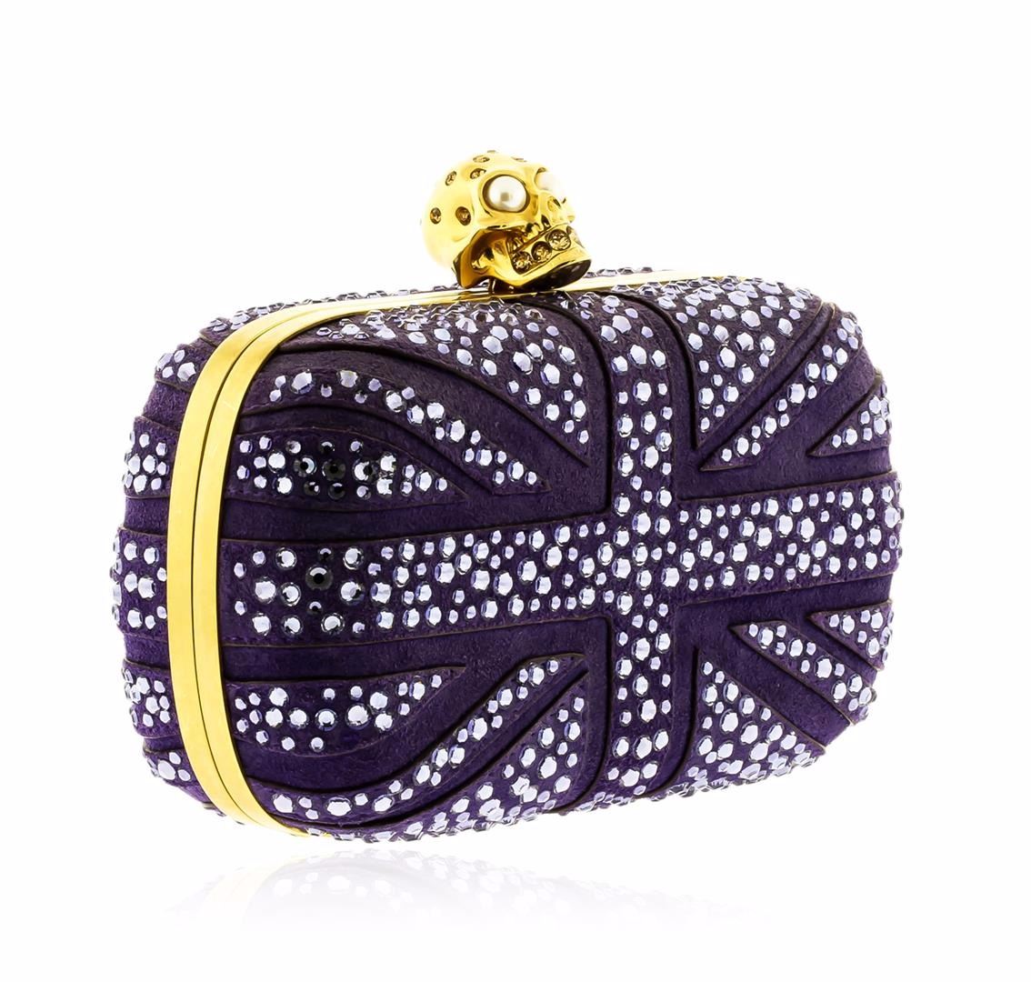 One Alexander McQueen Purple Suede Jewel Embroidered Clutch. This elegant clutch features purple suede with polished gold tone hardware, jewel embroidered body with skull details on top, button closure, and leather lining. Measures approximately 7" at widest x 5" tall at center x 3" deep. Estimated retail value $2,295.00.