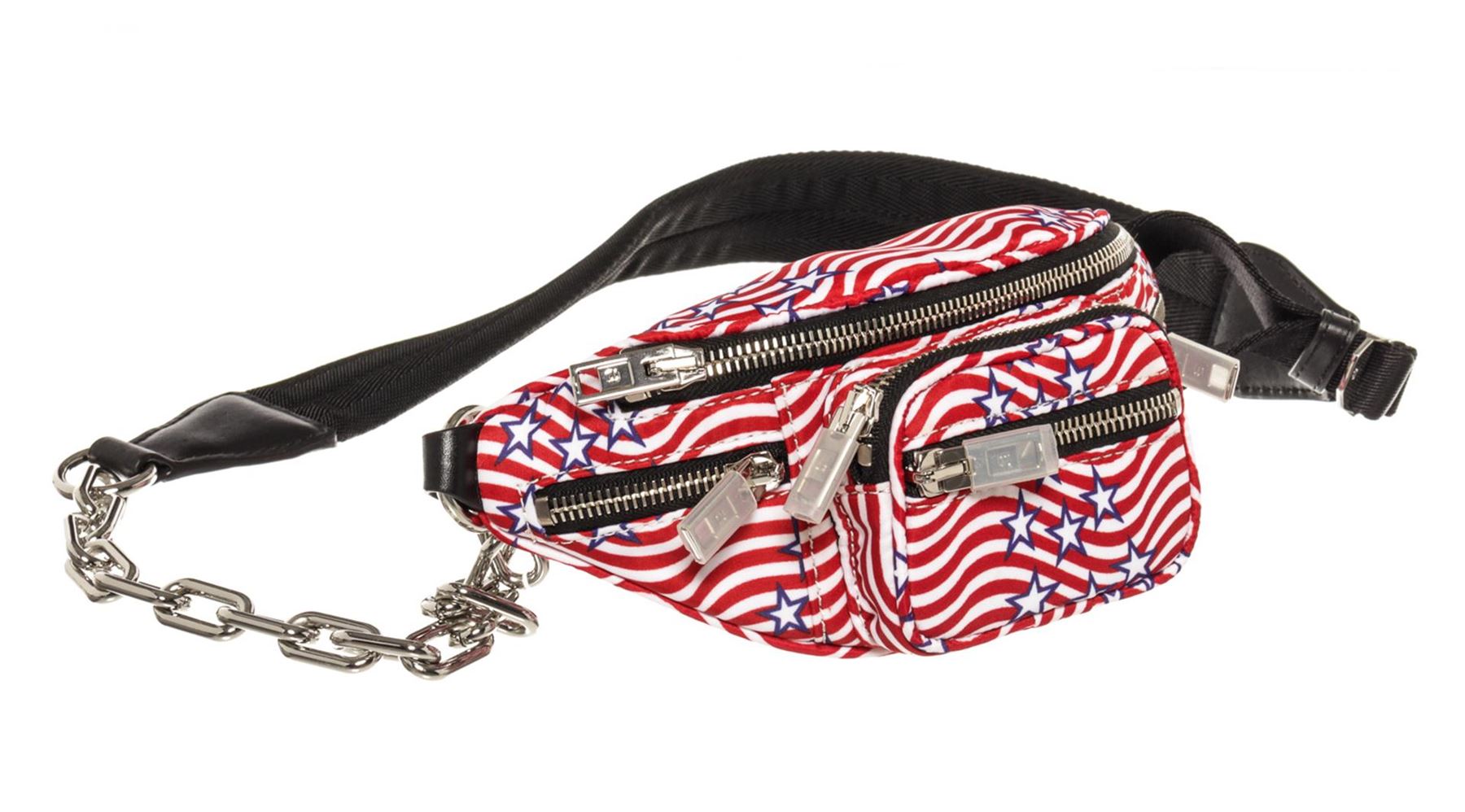 One Alexander Wang Red Monogram Nylon Attica Waist Bag. Item is sold AS-IS. All available information is listed in the description and shown in the photo. Red printed monogram nylon Alexander Wang Attica waist bag with silver-tone hardware, black leather trim, adjustable waist strap, three exterior pockets, black nylon lining and zip closure at top. Height: 3.5" Width: 9" Depth: 1.75" Strap Length: 45"