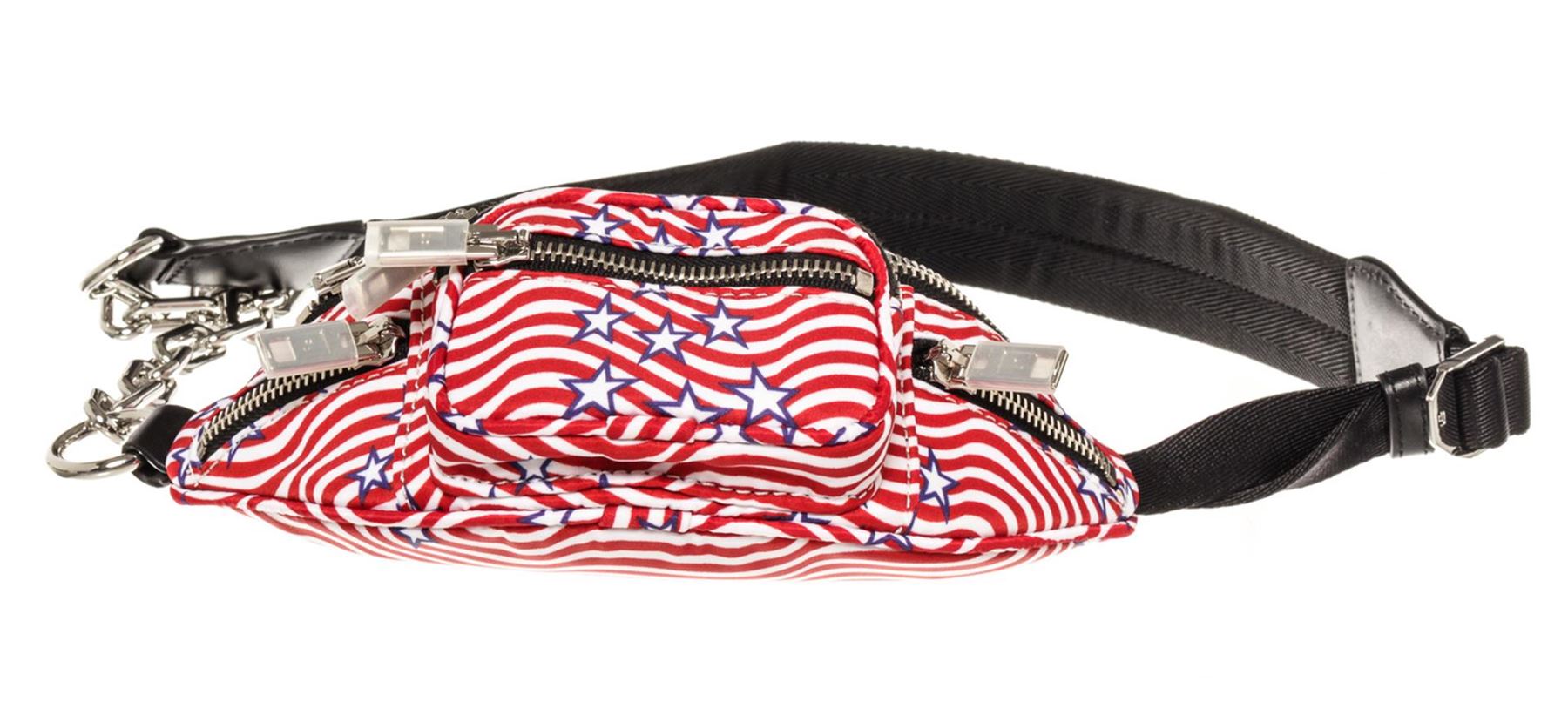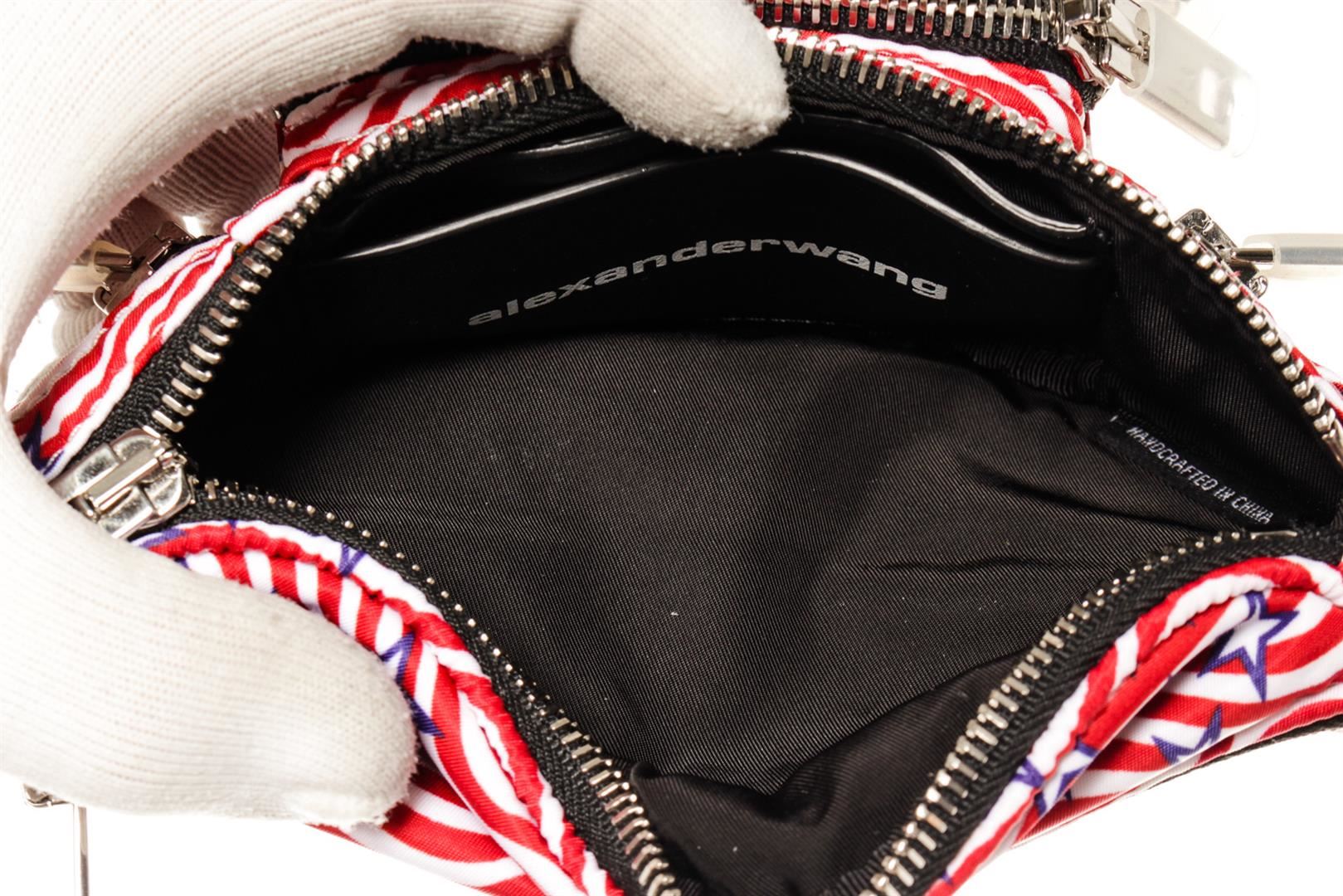 One Alexander Wang Red Monogram Nylon Attica Waist Bag. Item is sold AS-IS. All available information is listed in the description and shown in the photo. Red printed monogram nylon Alexander Wang Attica waist bag with silver-tone hardware, black leather trim, adjustable waist strap, three exterior pockets, black nylon lining and zip closure at top. Height: 3.5" Width: 9" Depth: 1.75" Strap Length: 45"