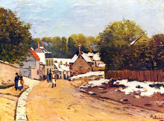 Artist: Alfred Sisley - Title: First Snow in Louveciennes - Medium: Fine Art Reproduction Giclee on Canvas - Image Size: Approximately 14.75 inches x 20 inches - Unframed on Unstretched Canvas - Biography: Alfred Sisley was an Impressionist landscape painter who was born and spent most of his life in France, but retained British citizenship. He was the most consistent of the Impressionists in his dedication to painting landscape en plein air.
