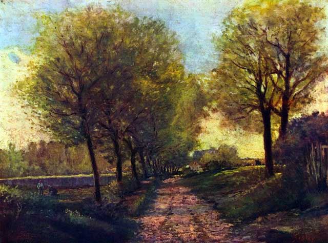 Artist: Alfred Sisley - Title: Lane Near a Small Town - Medium: Fine Art Reproduction Giclee on Canvas - Image Size: Approximately 14.75 inches x 20 inches - Unframed on Unstretched Canvas - Biography: Alfred Sisley was an Impressionist landscape painter who was born and spent most of his life in France, but retained British citizenship. He was the most consistent of the Impressionists in his dedication to painting landscape en plein air.