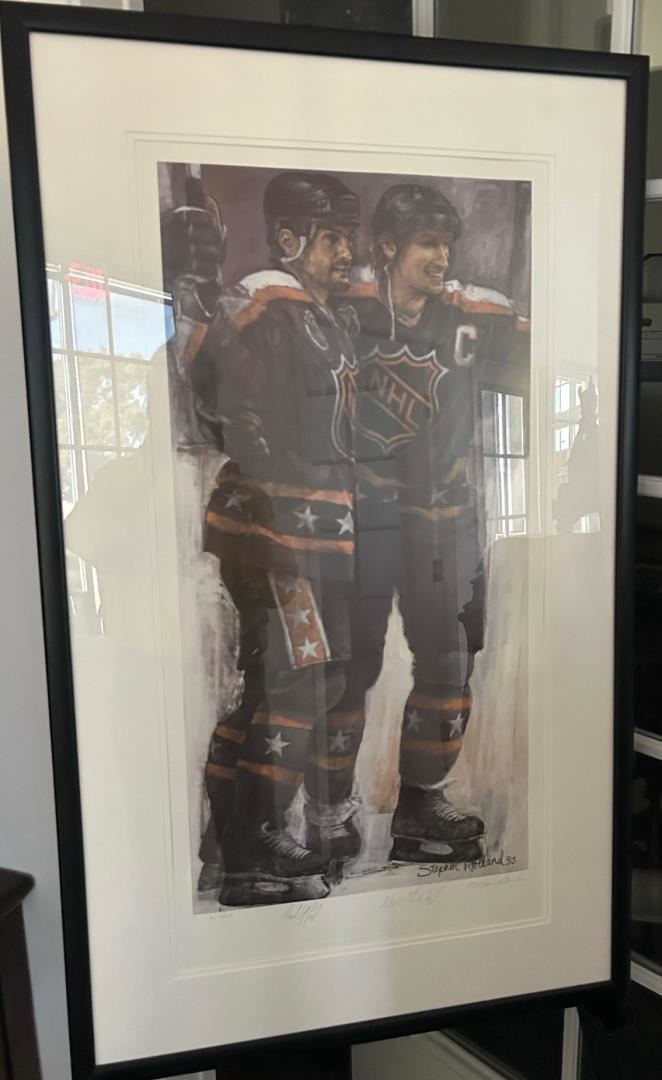 Wayne Gretzky & Paul Coffey "All Time Scorers", signed by both & Holland, framed 29.5" x 14.5" Litho 2/999, frame: 41.5" x 24.75", with COA