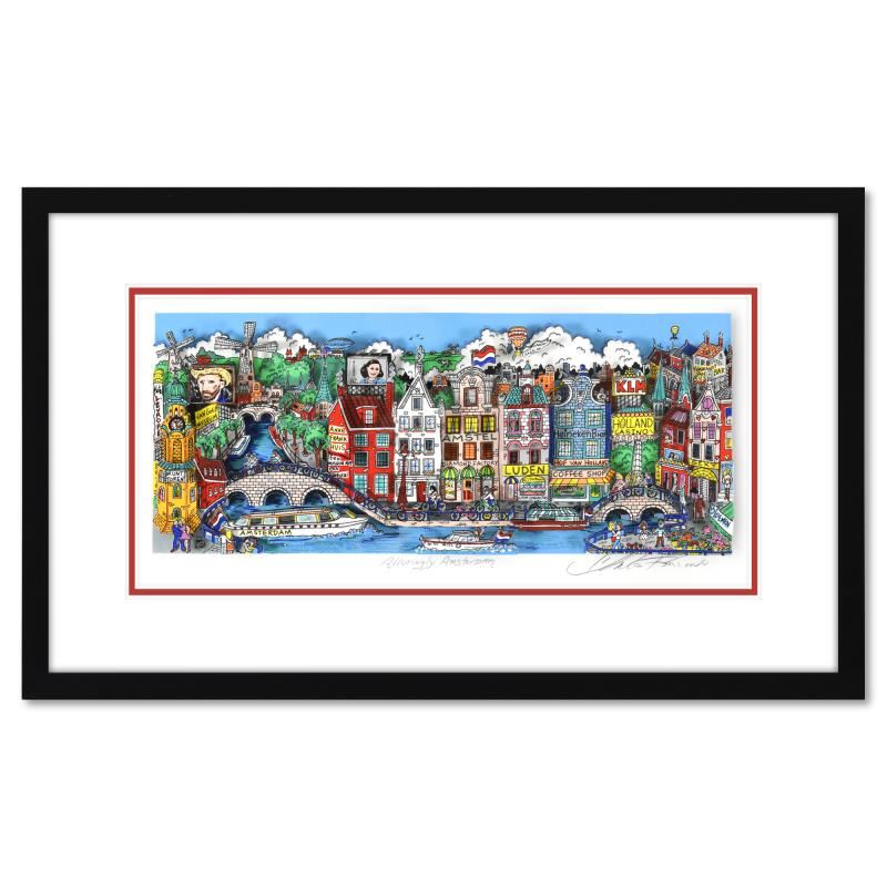 "Alluringly Amsterdam" is a 3D limited edition silk screen construct on paper by Charles Fazzino, DX numbered 351/4000 and hand signed by the artist. This piece comes custom framed. Includes Certificate of Authenticity. Measures approximately 23.5" x 14" (framed), 16" x 7" (image).