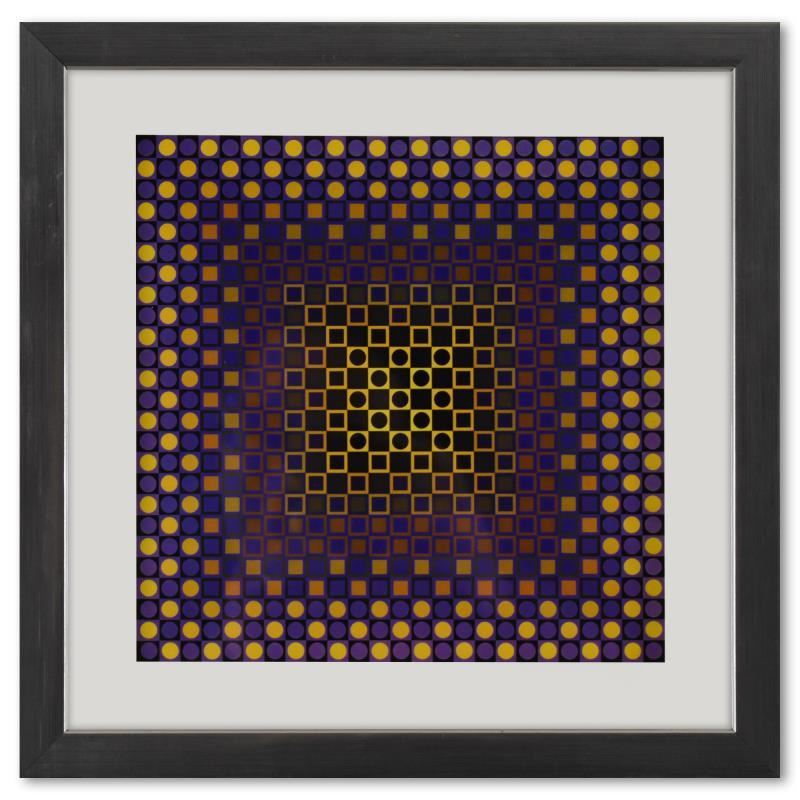 "Alom (Purple/Yellow) de la série Folklore Planetaire" is a heliogravure print on paper, published in 1971, by Victor Vasarely (1908-1997). This piece comes custom framed, with a letter of authenticity and with a 1976 Vasarely paperback. Measures approx. 11.5" x 11.5" (frame), 9" x 9" (image).