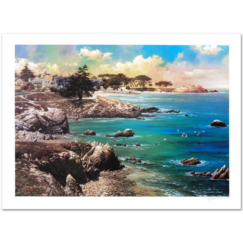 Alexander Chen creates stunningly detailed masterpieces filled with elaborate icons and a touch of fantasy. "Along the Coast" is a limited edition offset lithograph on paper by Alexander Chen, numbered and hand signed by the artist. Includes Certificate of Authenticity! Measures approx. 23.5" x 17.5" (with border), 21" x 15" (image).