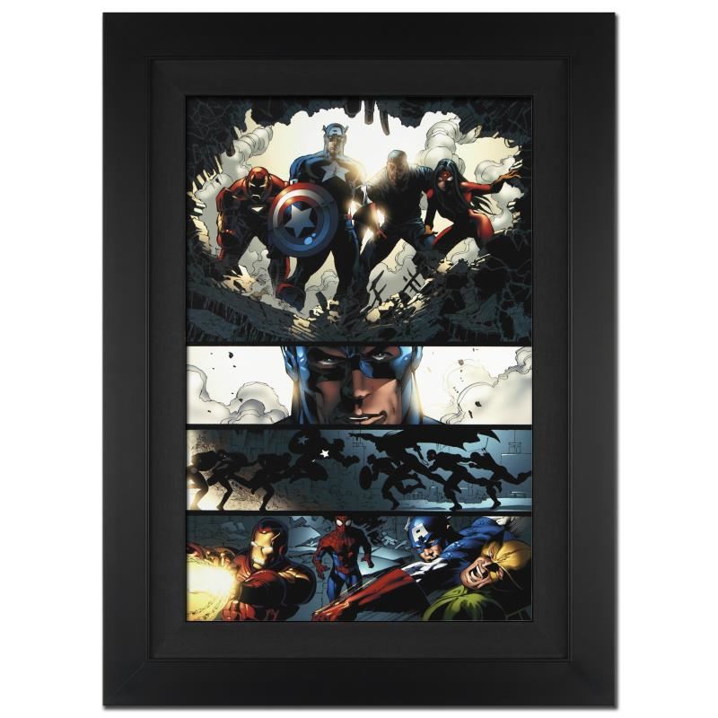 A piece of comic book history, this limited edition, from original art by Mike Deodato Jr., depicts Captain America, Luke Cage, Spider Woman, and Iron Man. Brazilian artist Mike Deodato Jr. has become an enduring fan favorite, working in styles ranging from wildly energetic cartooning to moody photorealism. Deodato became one of the decade's most prolific and in-demand artists, including Marvel credits such as Avengers, Elektra, Incredible Hulk, Spider-Man and Thor. "Amazing Spider-Man #523" is an extremely limited edition giclee on canvas by Mike Deodato Jr. presented by Marvel Comics, hand signed by the great Stan Lee and numbered out of only 10! This piece comes custom framed and ready to hang. Includes Certificate of Authenticity! Measures approx. 25" x 34" (with frame), 18" x 27" (image).
