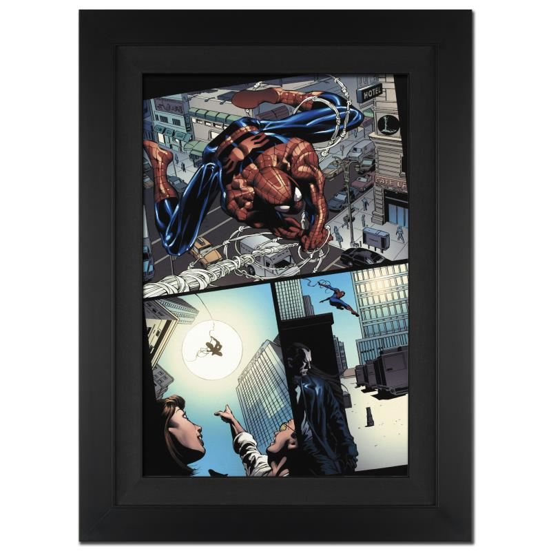 A piece of comic book history, this limited edition, from original art by Mike Deodato Jr., depicts a heroic Spider-Man. Brazilian artist Mike Deodato Jr. has become an enduring fan favorite, working in styles ranging from wildly energetic cartooning to moody photorealism. Deodato became one of the decade's most prolific and in-demand artists, including Marvel credits such as Avengers, Elektra, Incredible Hulk, Spider-Man and Thor. "Amazing Spider-Man #526" is an extremely limited edition giclee on canvas by Mike Deodato Jr. presented by Marvel Comics, hand signed by the great Stan Lee and numbered out of only 10! This piece comes custom framed and ready to hang. Includes Certificate of Authenticity! Measures approx. 25" x 34" (with frame), 18" x 27" (image).
