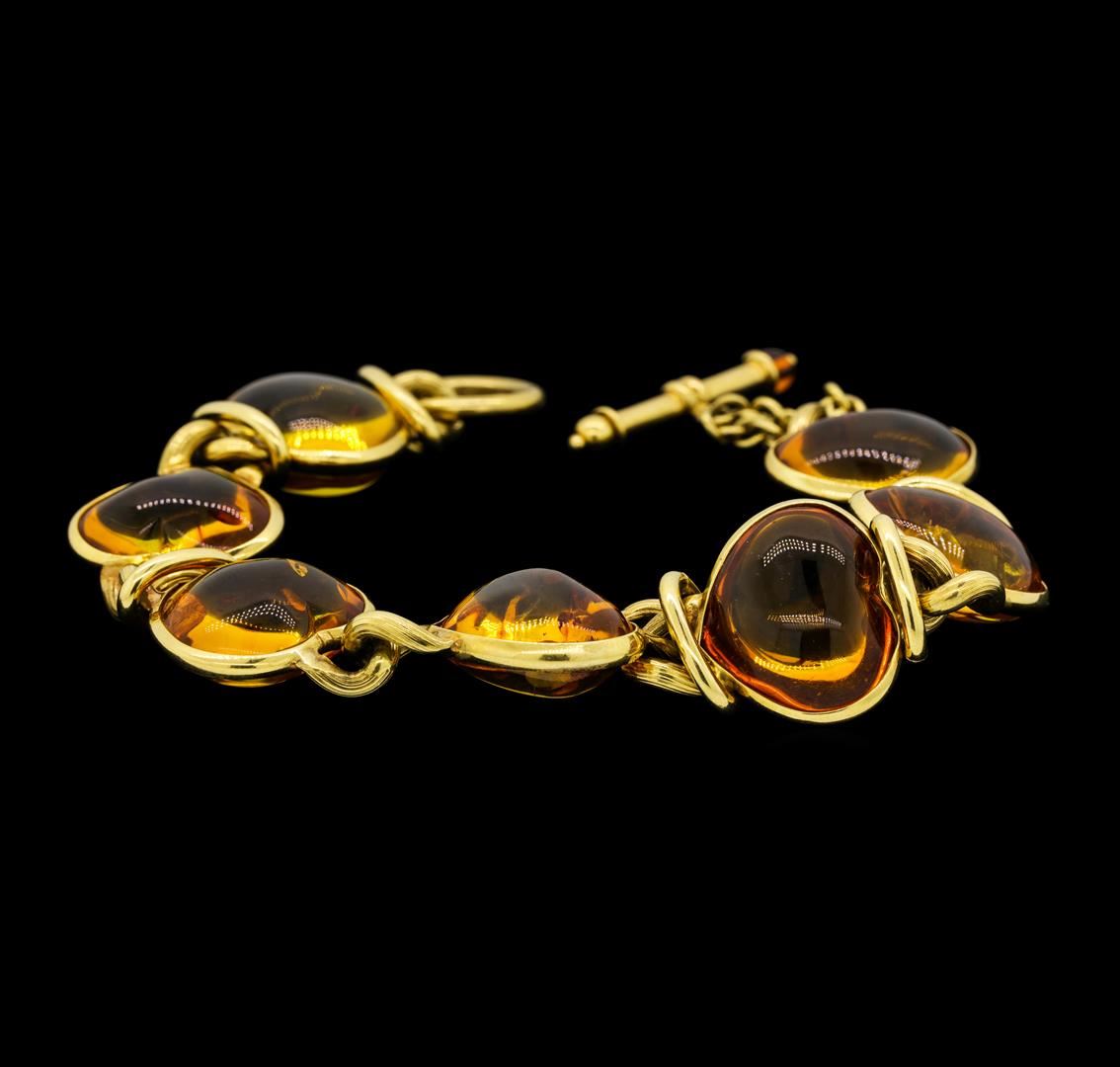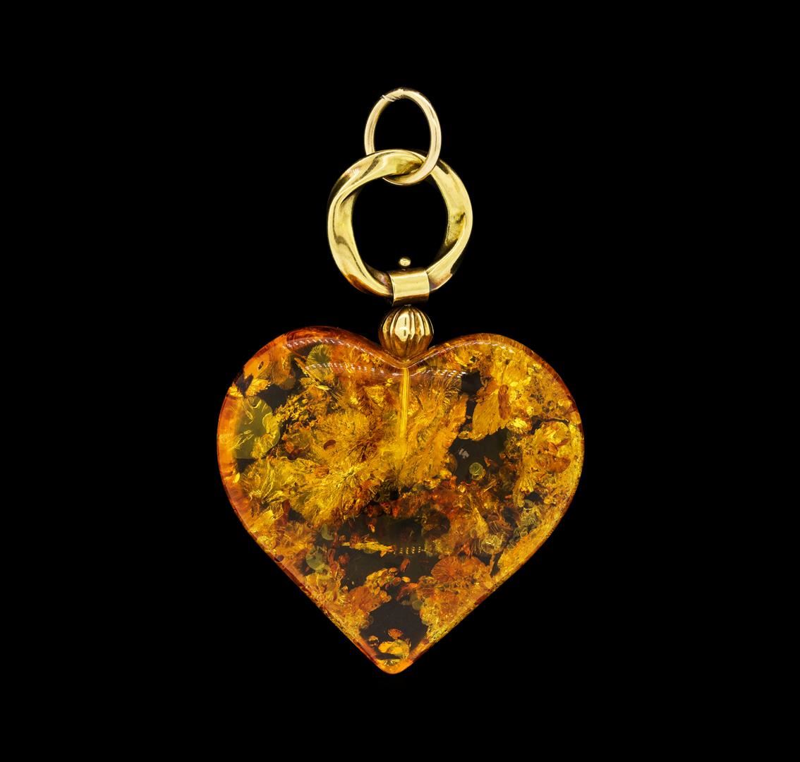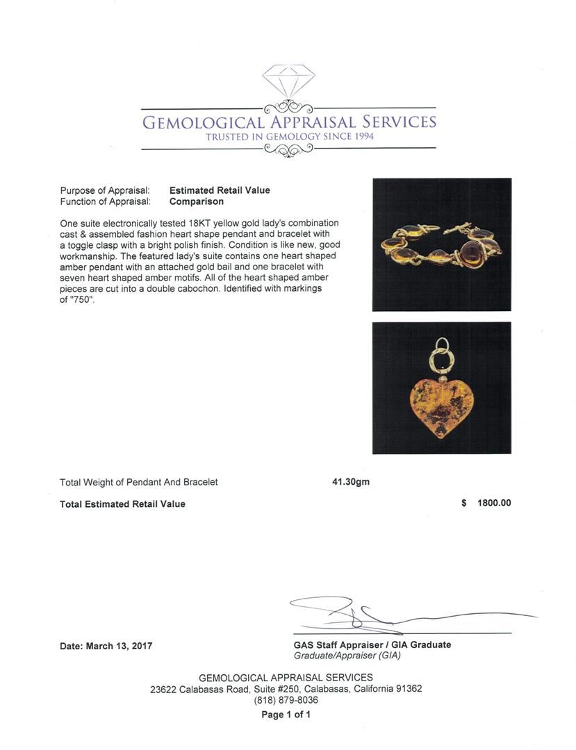 One suite electronically tested 18KT yellow gold lady's combination cast & assembled fashion heart shape pendant and bracelet with a toggle clasp with a bright polish finish. The featured lady's suite contains one heart shaped amber pendant with an attached gold bail and one bracelet with seven heart shaped amber motifs. All of the heart shaped amber pieces are cut into a double cabochon. Identified with markings of '750'. Condition is like new, good workmanship.. Total Weight of Pendant And Bracelet 41.30gm GAS Appraised at $1,800.00.