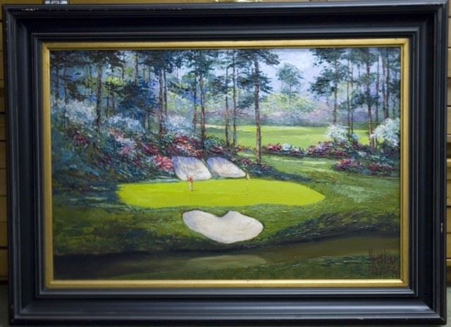 Amen Corner is known as such because golfers at the end of holes 11-13 of the Augusta National Golf Course in Georgia, are known to utter an "Amen " for having survived this troublesome part of the very challenging 18 hole Course on which they play The Masters. Master Artist Mark King (1931-2014) - best known for his sports and equestrian paintings - was especially fond of the azalea covered links and beautiful green fairways that adorn the course at Augusta. This painting can be delivered in this distressed black molding with gold trim, or stretched but unframed. Your choice. Measures 24x36 inches.