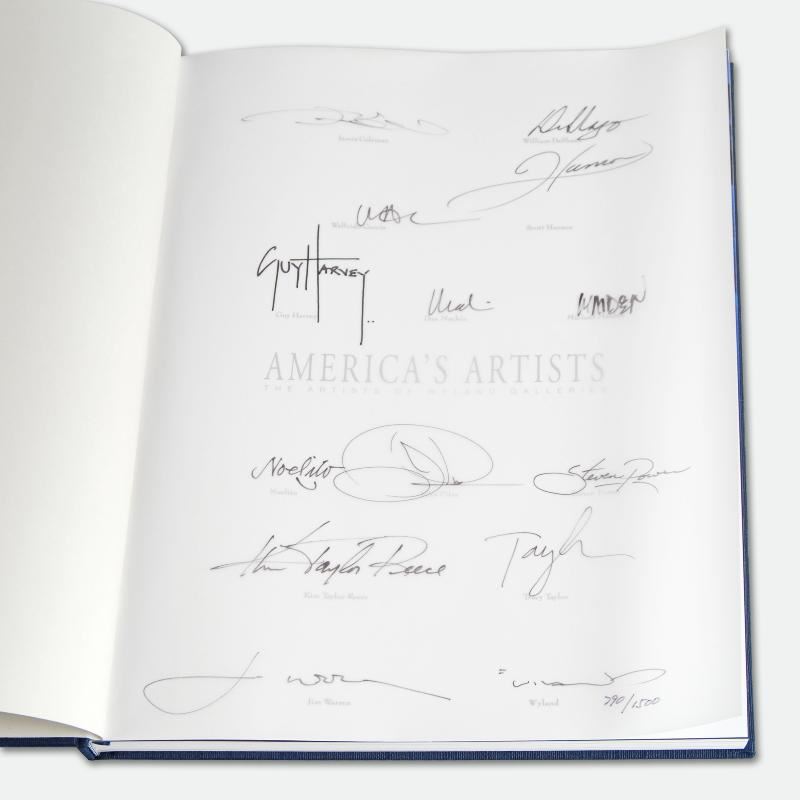 Wyland's exquisite and colorful paintings are expressive, emotive and world-famous. "America's Artists: The Artists of Wyland Galleries" (2004) is a deluxe limited edition Collector's Fine Art hardcover book with text by Wyland featuring the work of 13 of his esteemed artists! Numbering 160 pages with full color text and images, this book is hand signed by (in alphabetical order): James Coleman, William DeShazo, Walfrido Garcia, Scott Hanson, Guy Harvey, Dan Mackin, Michael Maiden, Noelito, John Pitre, Steven Power, Kim Taylor-Reece, Tracy Taylor, Jim Warren, and of course, Wyland. Comes in a special Collector's Gift Box and includes a Limited Edition Lithograph of Wyland's "Ocean Passion" measuring approx. 8" x 11" (with border); 7.5" x 10" (image), numbered and hand signed by Wyland. This book is numbered out of only 1500, and features a vellum front page that is numbered, and hand signed by Wyland and all of his artists! Includes Certificate of Authenticity. Measures approx. 10" (width) x 13" (height) x 1/2" (thick).