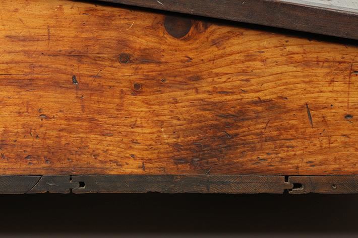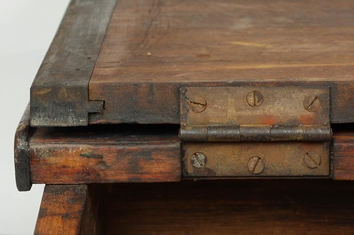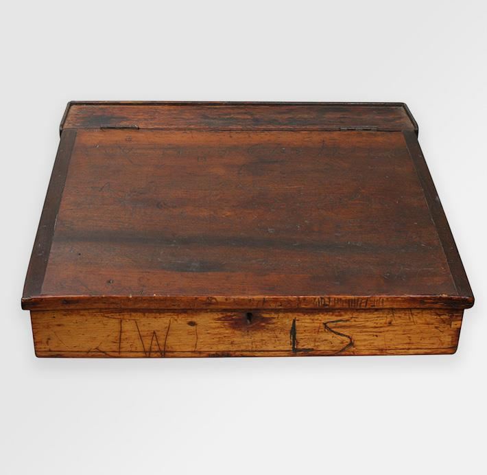 One antique school house masters desk. Gorgeous original surface, square nails, dove tailed and tongued groove. Desk measures 25.25 inches deep x 28 inched wide, 8.25 inched tall at back and 5.25 inches tall in front.