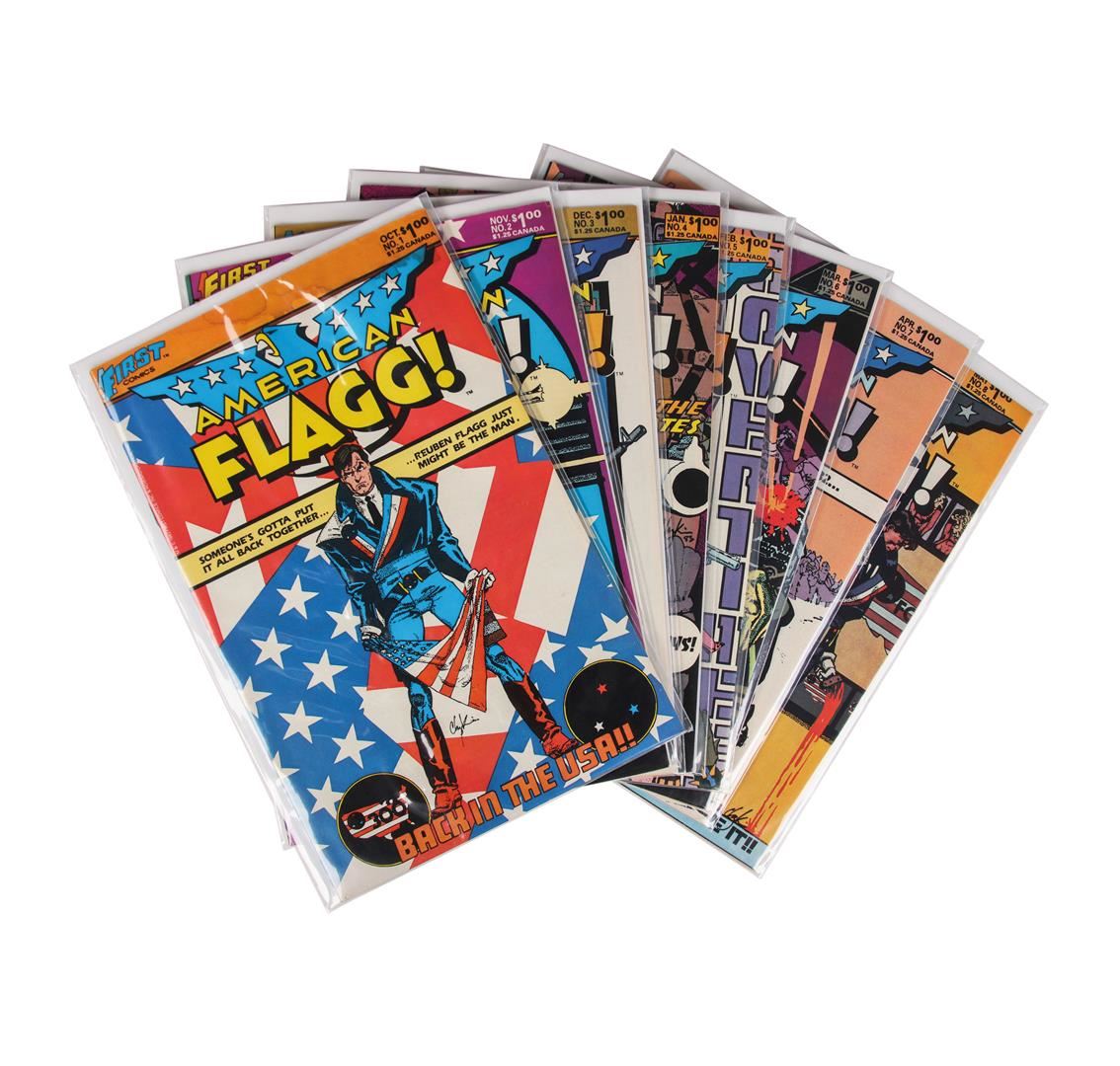 One set of fifteen issues of American Flagg! And American Heroes, containing issues #1-10, #16-18, and #21 of American Flagg! and issue #29 of Amazing Heroes.