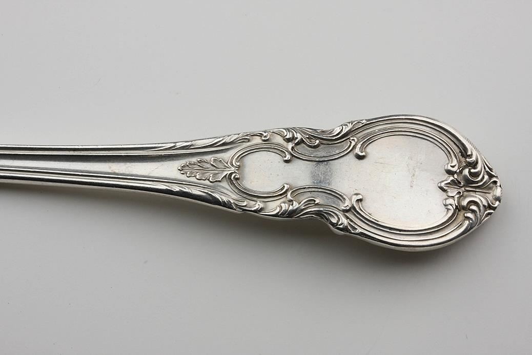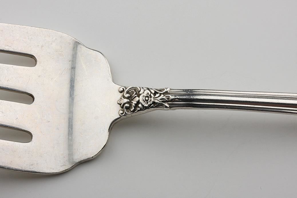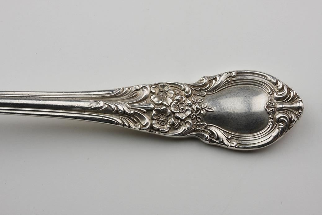 Vintage 8 Piece Sterling Silver Completer Serving Set ED1395 . Sterling silver "American Victorian" 8 piece completer serving set by Lunt. Set includes:1. Salad fork 8.25" 2. Salad spoon 7.25" 3. Master butter 6.75" 4. Jelly spoon 6" 5. Lemon fork 5" 6. Casserole spoon 8.75" 7. Cold meat fork 8. pickle fork 5.5".