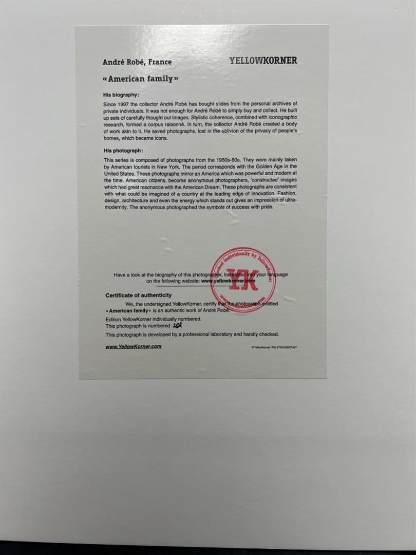 Andre Robe France American Family YellowKorner Certified Photograph. Certificate of Authenticity from YellowKorner affixed to the back. Matted Dimensions 16"x20". Protected with Clear Mylar Sleeve.
