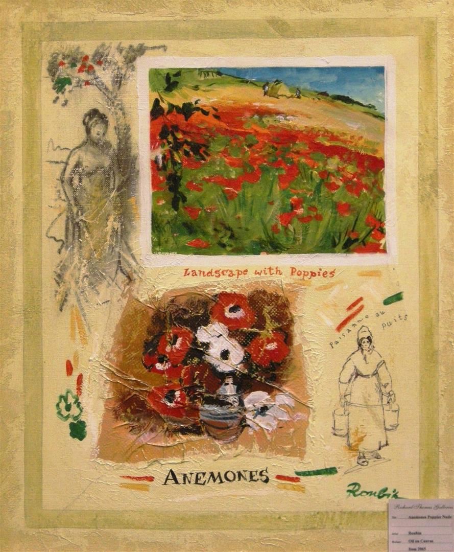 Brightly-colored anemones join the collection of images by Olga Roubin, including a landscape with poppies and sketches of women in varying historical periods. The oil on canvas measures 23.5 x 21; framed image measures approx. 35.5 x 33.