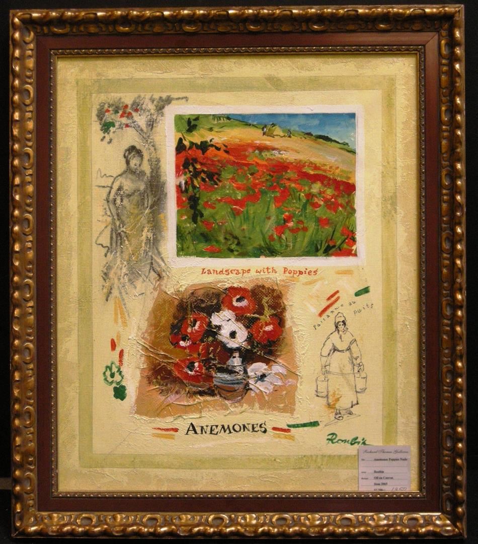 Brightly-colored anemones join the collection of images by Olga Roubin, including a landscape with poppies and sketches of women in varying historical periods. The oil on canvas measures 23.5 x 21; framed image measures approx. 35.5 x 33.