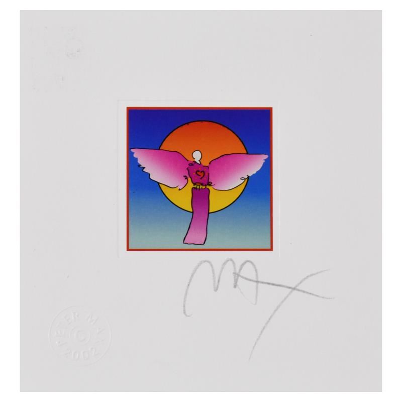 Angel with Sun (Ver II) by Peter Max. All available information is listed in the description and shown in the photo. "Angel with Sun (Ver II)" is a limited edition lithograph on paper by Peter Max, numbered 442/500 and hand signed by the artist. This piec