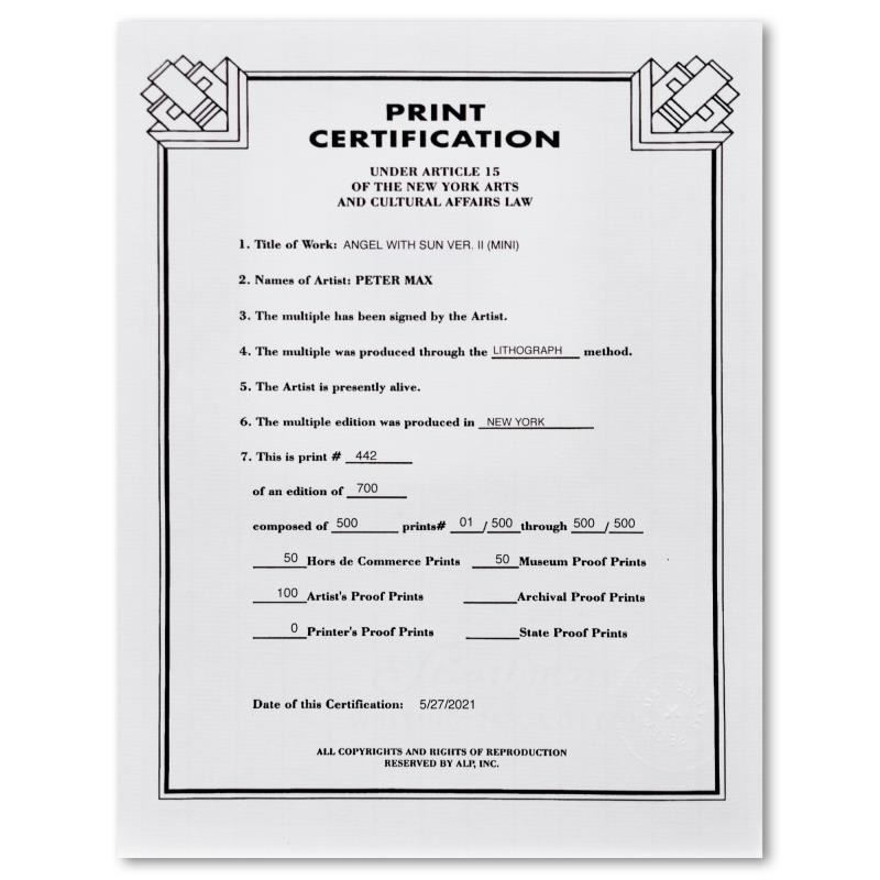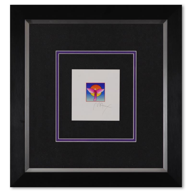 Angel with Sun (Ver II) by Peter Max. All available information is listed in the description and shown in the photo. "Angel with Sun (Ver II)" is a limited edition lithograph on paper by Peter Max, numbered 442/500 and hand signed by the artist. This piece comes framed. Includes Certificate of Authenticity from Peter Max Studios. Measures approximately 16.5" x 17.5" (frame), 4.5" x 5" (image).