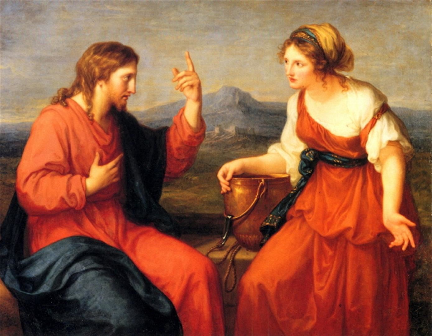 Artist: Angelica Kauffman - Title: Christ and the Samaritan Woman - Medium: Fine Art Giclee on Canvas - Image Size: Approximately 32 inches x 25 inches - Unframed on Unstretched Canvas - Details: - Biography: Maria Anna Angelika Kauffmann (October 1741 - November 1807), usually known in English as Angelica Kauffman, was a Swiss Neoclassical painter who had a successful career in London and Rome. Remembered primarily as a history painter, Kauffmann was a skilled portraitist, landscape and decoration painter. She was, along with Mary Moser, one of two female painters among the founding members of the Royal Academy in London in 1768.