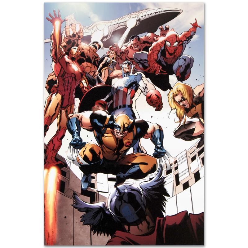 Annihilators: Earthfall #1 by Marvel Comics. A piece of comic book history, this limited edition, from original art by Tan Eng Huat, depicts Wolverine, Captain America, Iron Man, Ms. Marvel, Spider-Man, Thing, Valkyrie, and Red Hulk. Named 'Best New Talent' in the National Comics Awards (NCA) 2002, Tan Eng Huat has been a featured artist for different comic companies such as Marvel. He is most recognized for his work on the Punisher, Ghost Rider, Annihilators, and Deadpool comics. "Annihilators: Earthfall #1" is a limited edition numbered giclee on stretched canvas by Tan Eng Huat presented by Marvel Comics. This piece comes gallery wrapped. Includes Certificate of Authenticity! Measures approx. 18" x 27" (image); 1.5" (depth). This item requires special handling and may have a longer than usual turnaround.