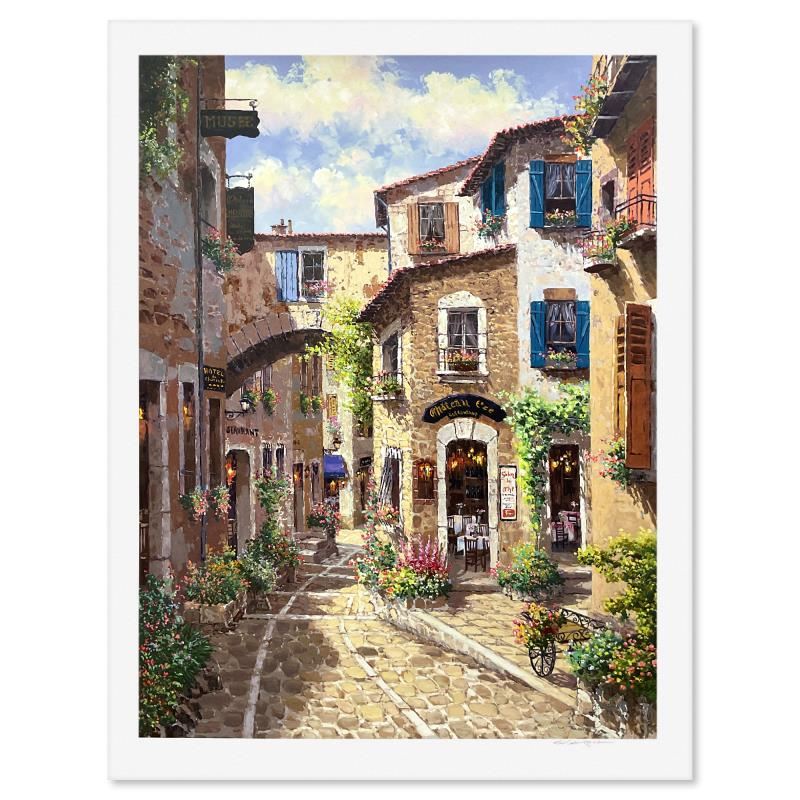 "Antibes" is a limited edition printer's proof serigraph on paper by Sam Park, numbered and hand signed by the artist. Includes Letter of Authenticity. Measures approx. 44.5" x 34" (border), 40" x 30" (image).