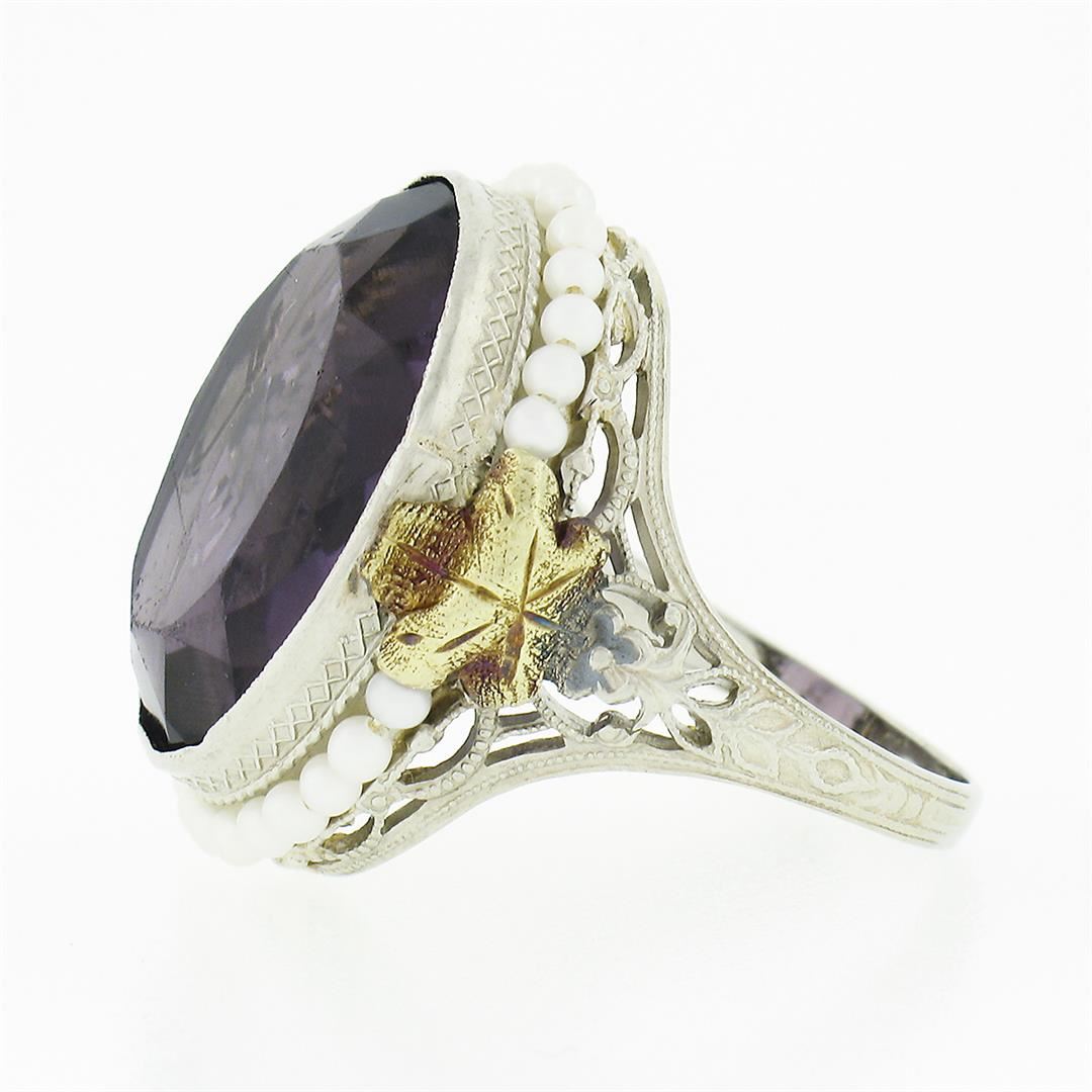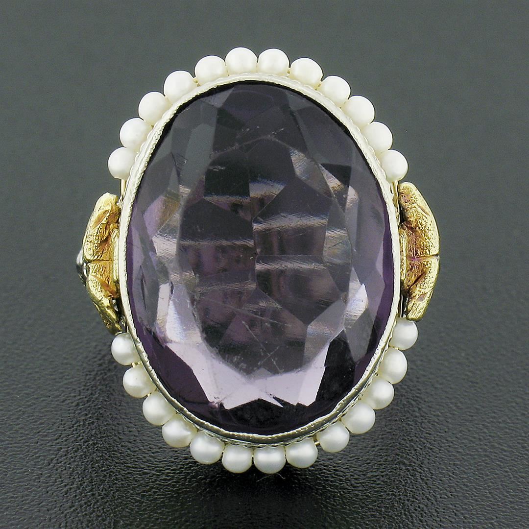 An antique solid 10k yellow & white gold filigree ring, with 1 oval brilliant cut purple stone (17.6x13.3mm ), surrounded with 25 round shape cultured seed pearls (1.75mm each). The ring is size 6.0, weighs a total of 5.33 grams, and measures 21.60mm wide.