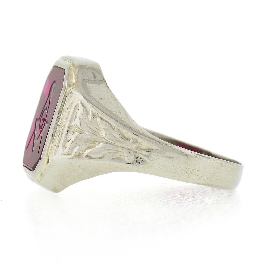 An antique solid 10k white gold masonic ring with 1 rectangular shape red stone (11.4x9.3mm). The ring is size 10.0, weighs a total of 4.22 grams, and measures 14.80mm wide.