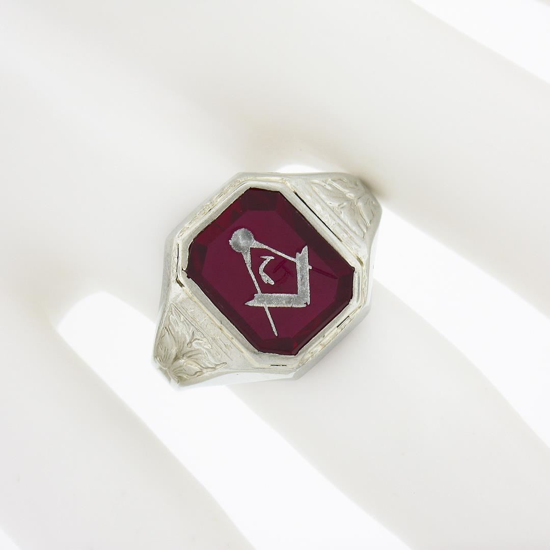 An antique solid 10k white gold masonic ring with 1 rectangular shape red stone (11.4x9.3mm). The ring is size 10.0, weighs a total of 4.22 grams, and measures 14.80mm wide.