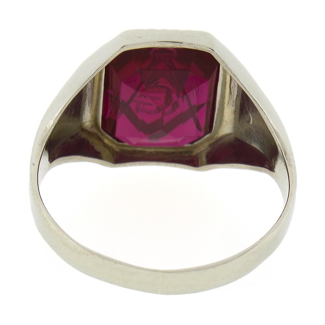 An antique solid 10k white gold masonic ring with 1 rectangular shape red stone (11.4x9.3mm). The ring is size 10.0, weighs a total of 4.22 grams, and measures 14.80mm wide.