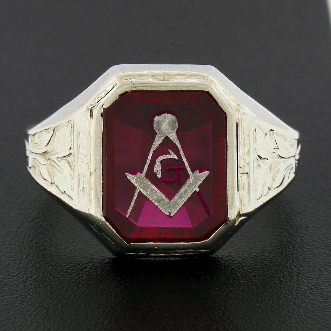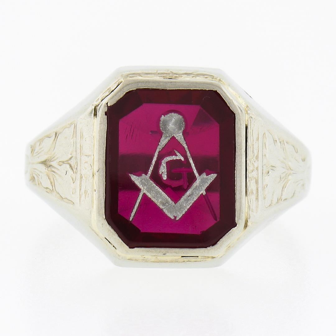 An antique solid 10k white gold masonic ring with 1 rectangular shape red stone (11.4x9.3mm). The ring is size 10.0, weighs a total of 4.22 grams, and measures 14.80mm wide.