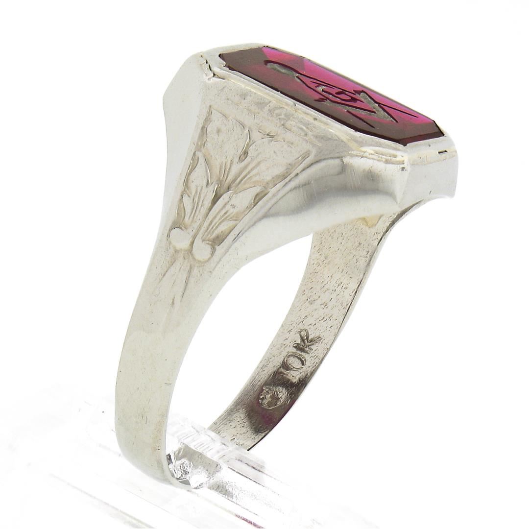 An antique solid 10k white gold masonic ring with 1 rectangular shape red stone (11.4x9.3mm). The ring is size 10.0, weighs a total of 4.22 grams, and measures 14.80mm wide.