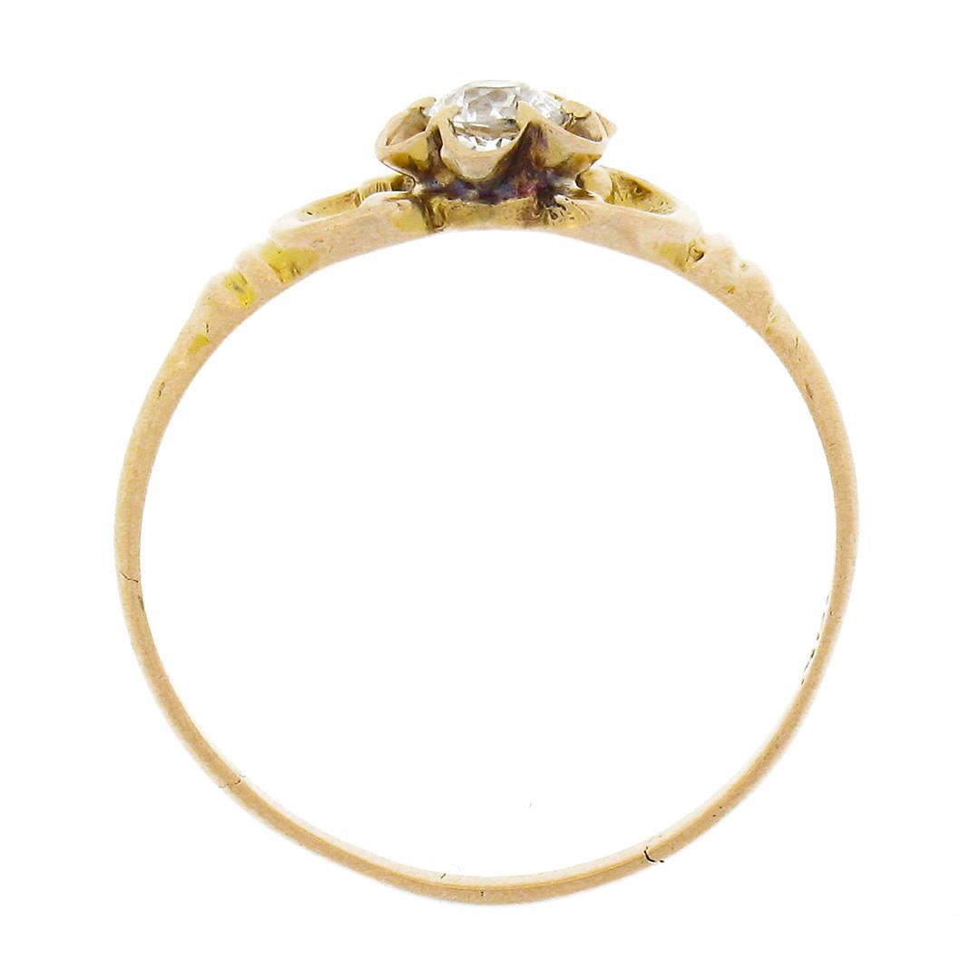 An antique solid 10k yellow gold engagement ring, with 1 old european cut natural diamond (G - VS2 ; 0.25ct). The ring is size 7.5, weighs a total of 1.32 grams, and measures 6.65mm wide.