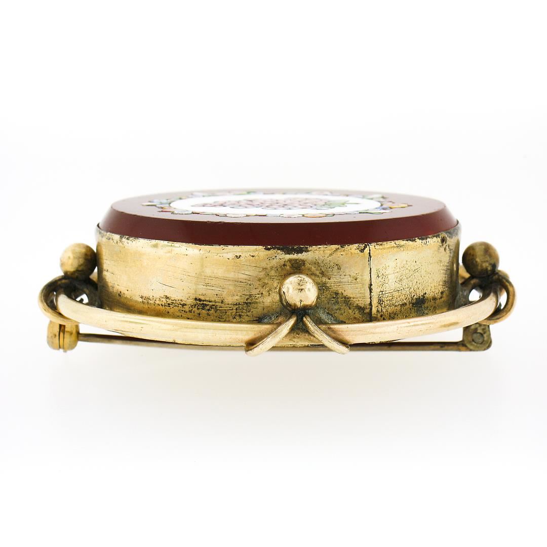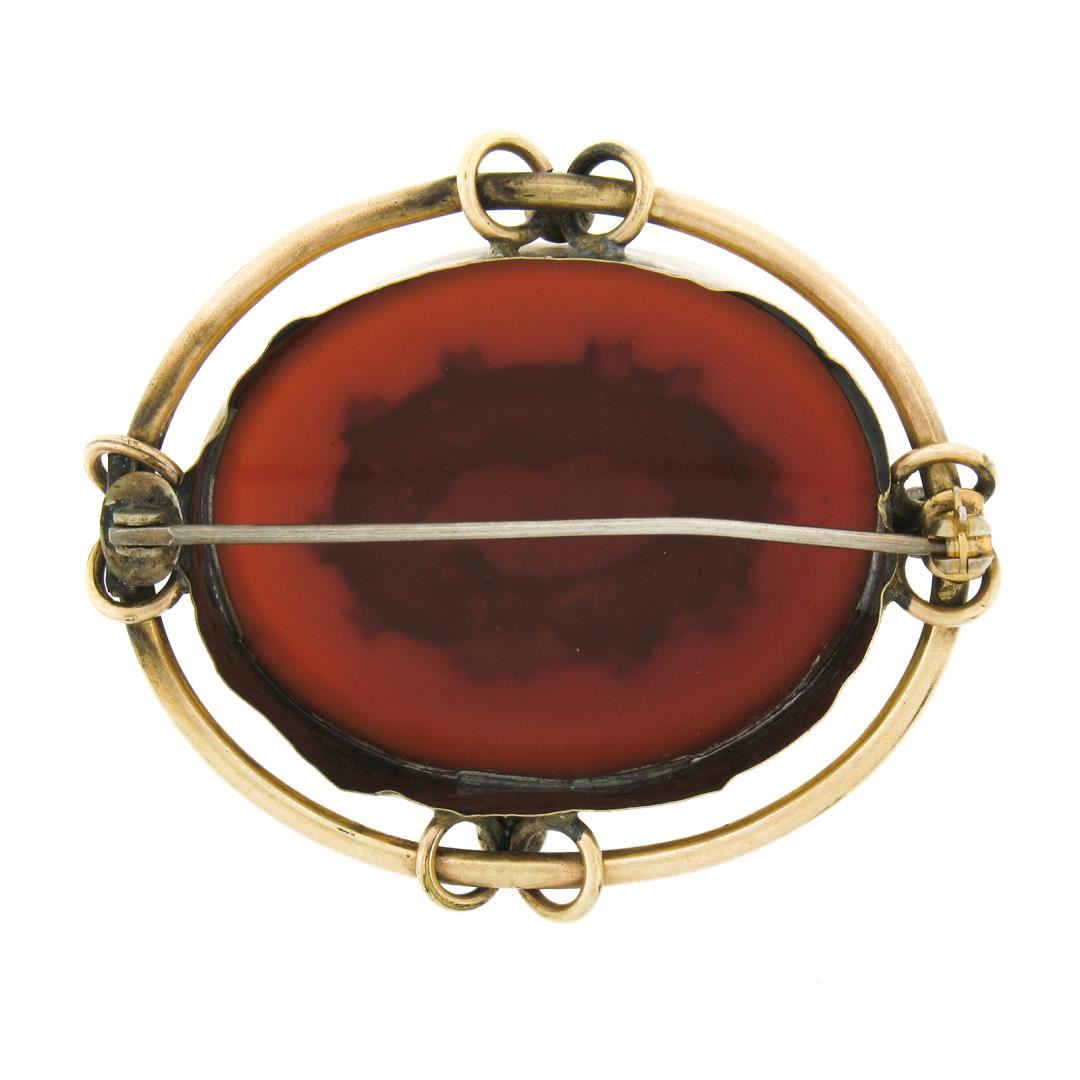 An antique solid 10k yellow gold brooch, with 1 oval cut natural carnelian (41.3x32.5mm ). Measures 54.3x46.7mm and weighs a total of 21.33 grams.