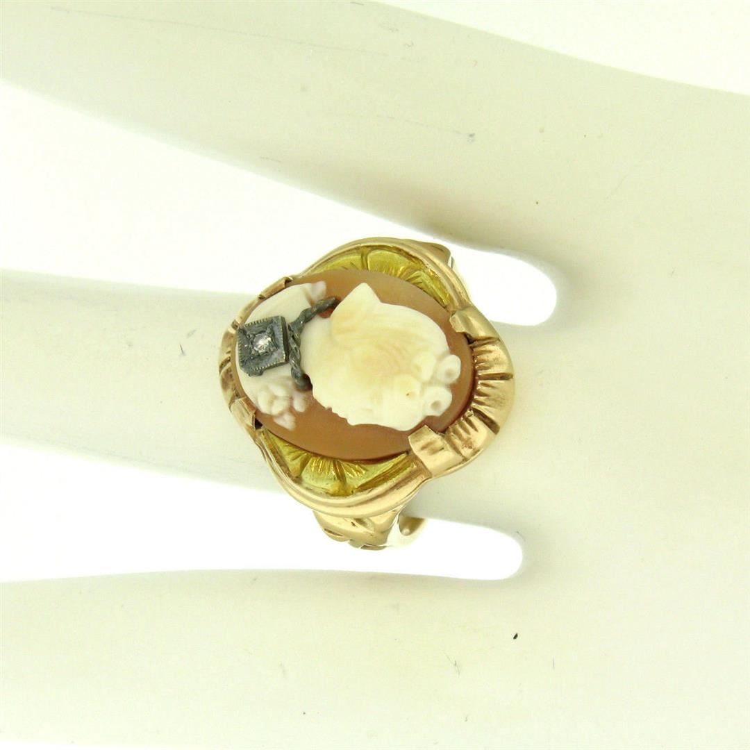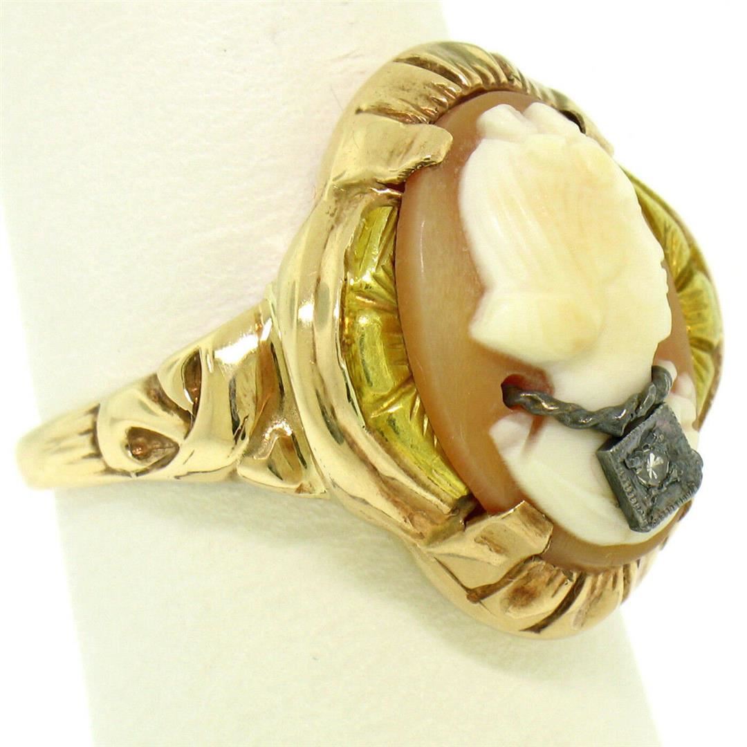 An excellent condition antique 10k rose and green gold ring prong set with an oval carved shell cameo accented with a 0.02ct round single cut diamond. The ring is size 7, weighs a total of 4.7 grams, and measures 20.4mm wide.