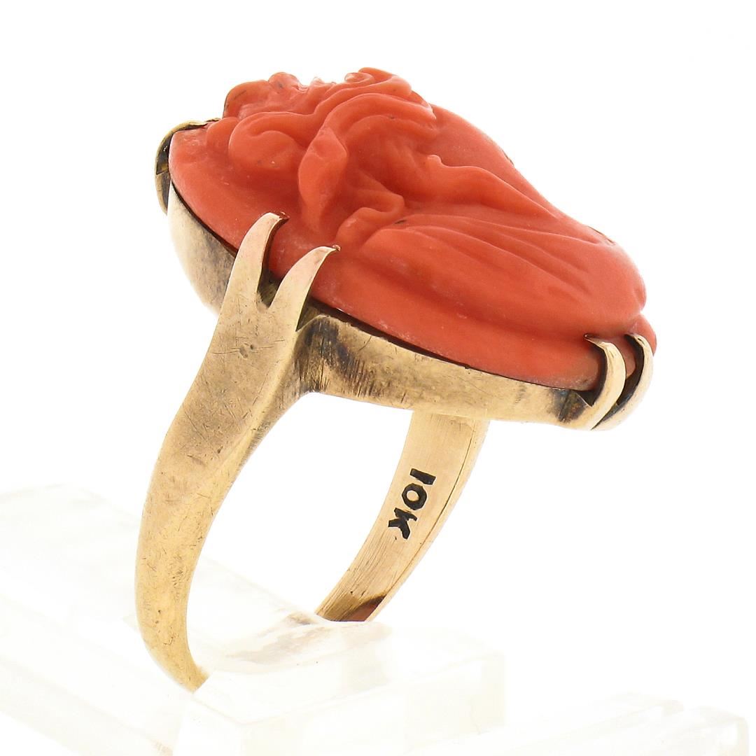 An antique solid 10k yellow gold cameo ring, with 1 carved oval shape natural coral (19.1x14.5mm). The ring is size 4.0, weighs a total of 4.79 grams, and measures 20.40mm wide.